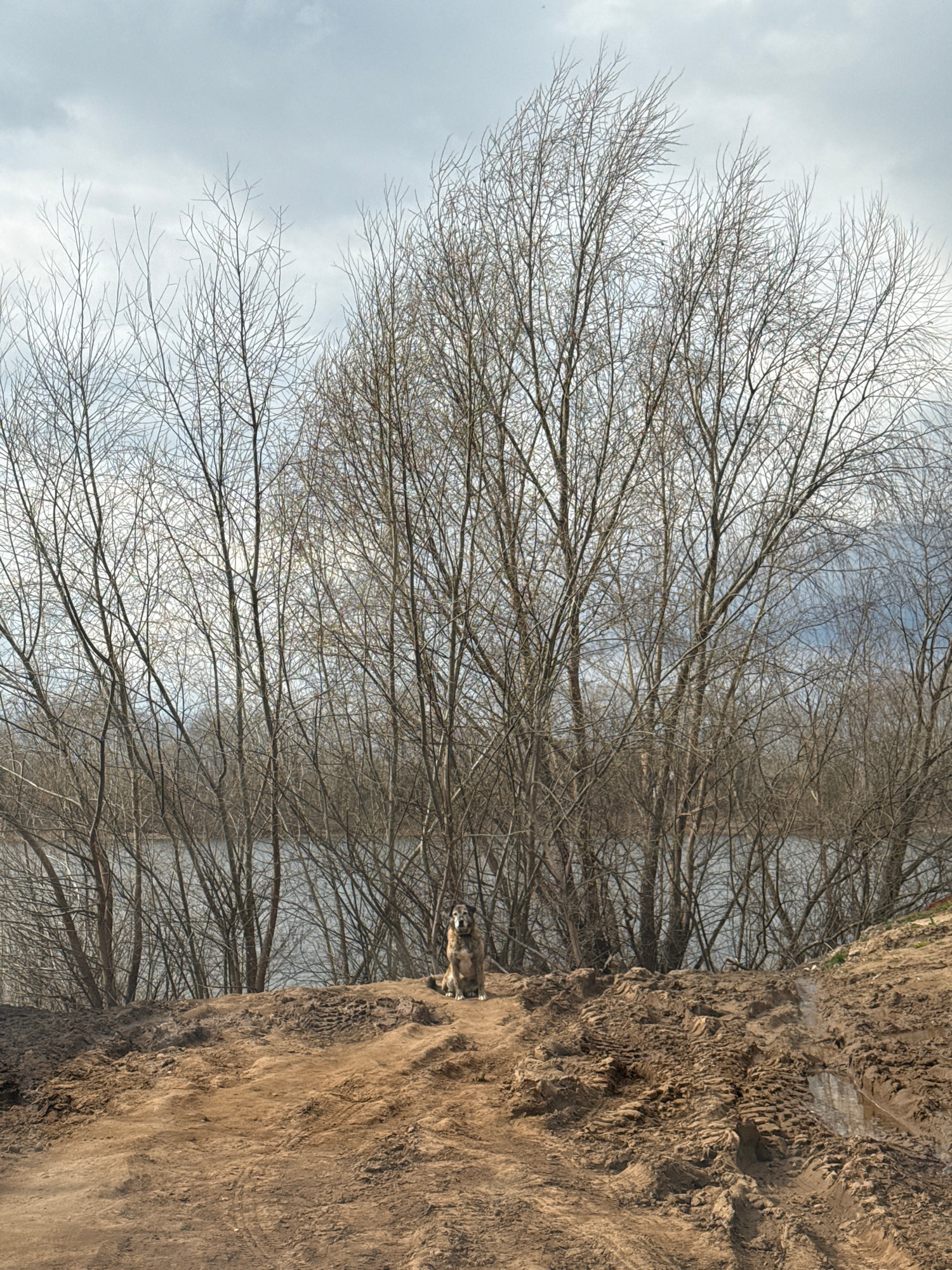 A dog stands on a dirt embankment next to bare trees under a cloudy sky. The location is Chaikovsky, Russia.