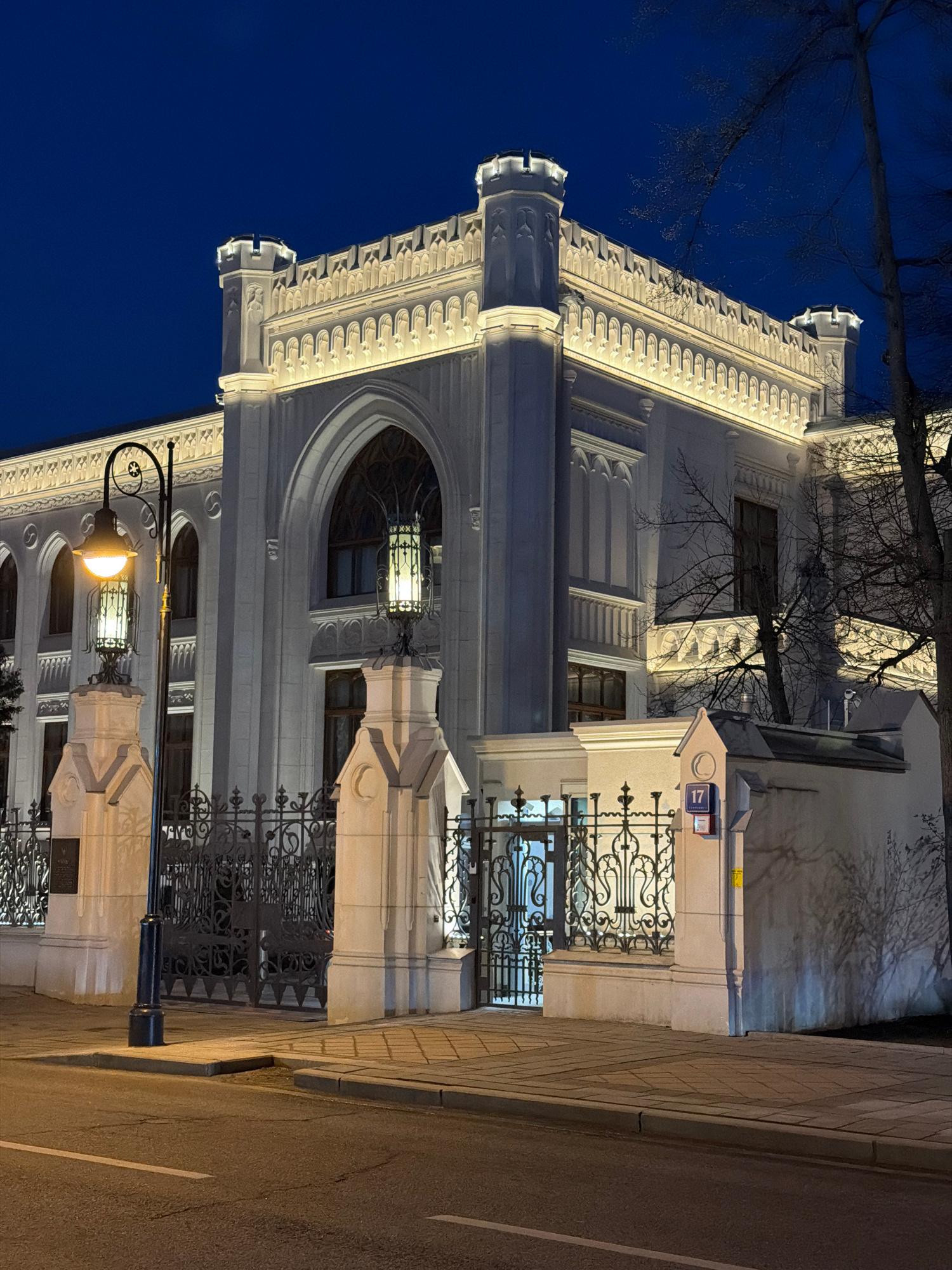 The image shows a section of the Perl House at night, located at Chistoprudny Boulevard, 17 in Moscow, Russia. The building features elaborate architectural details including arched windows, decorativ…read more