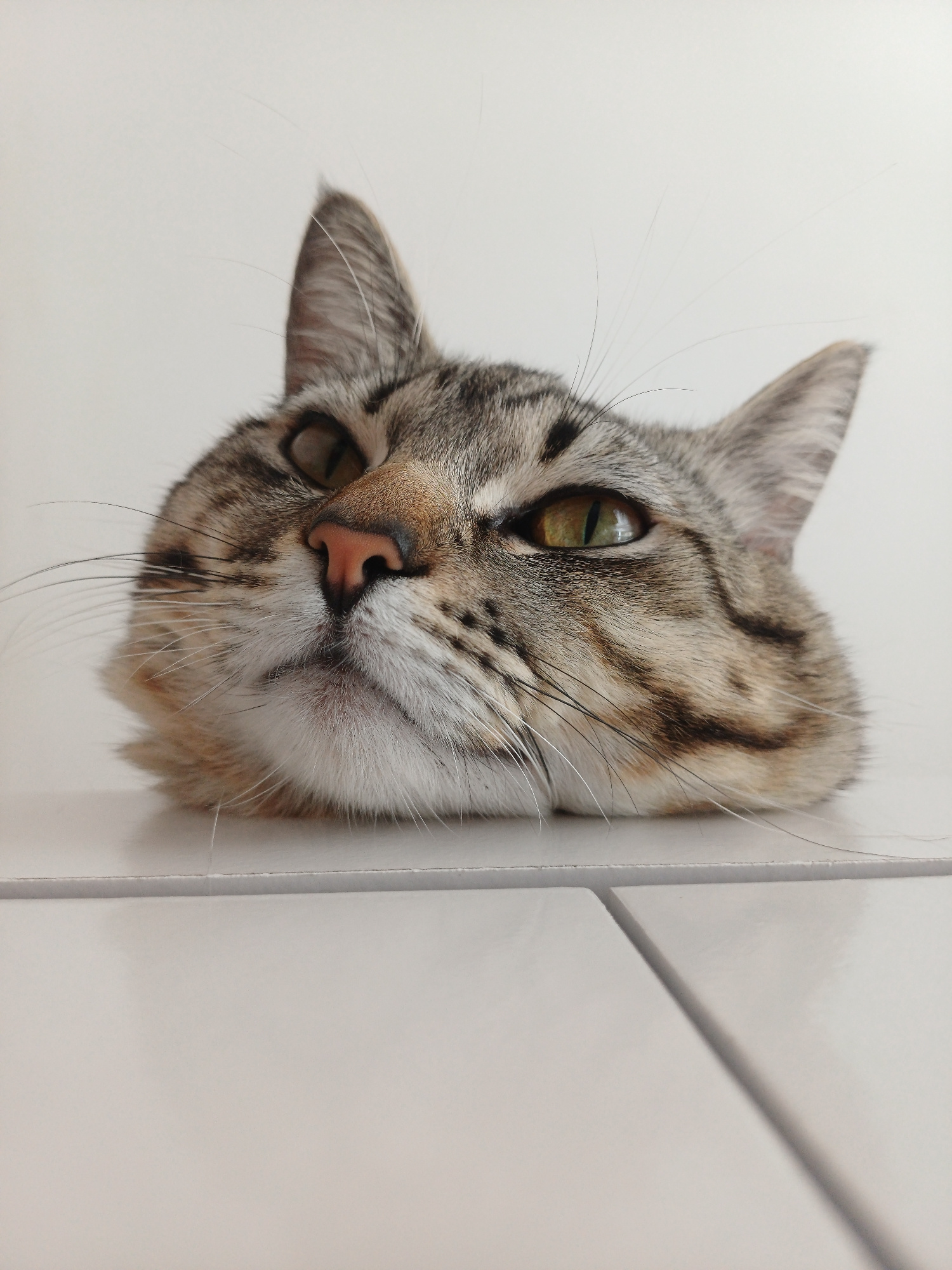 A close-up shot, rotated 180 degrees, features a cat's head emerging from between two white panels. The cat is light brown and grey tabby with green eyes and a pink nose. Its whiskers are prominent ag…read more