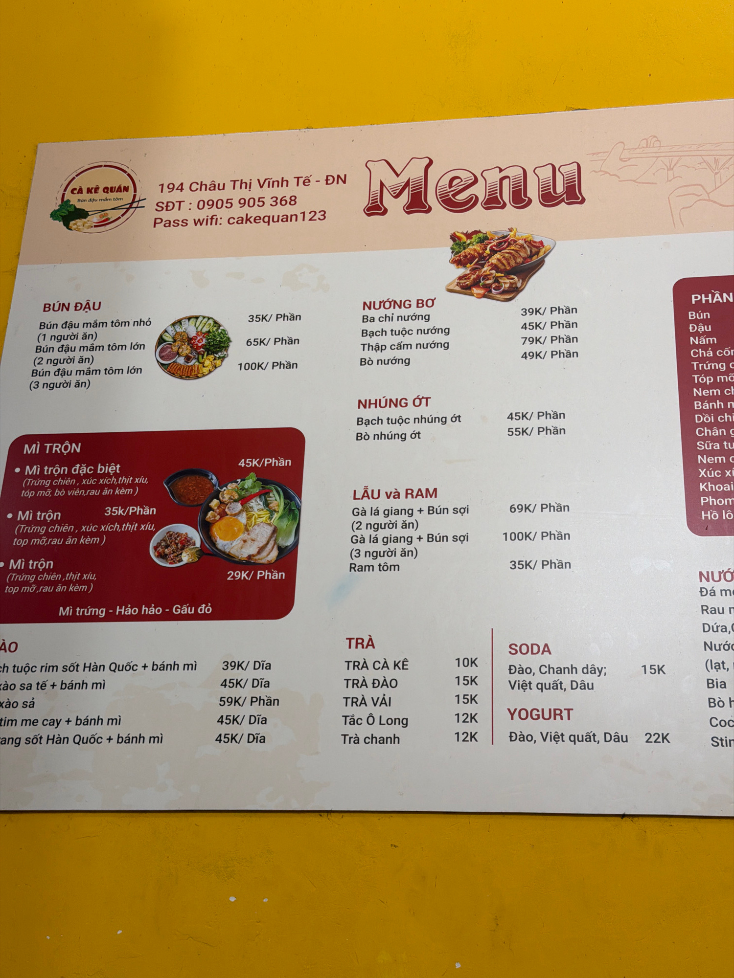 The image is a menu from a Vietnamese restaurant called "CÀ KẾ QUÁN" (Bún đậu mắm tôm), located at 194 Châu Thị Vĩnh Tế - ĐN in the city of Đà Nẵng, Vietnam. The menu is printed on a laminated surface…read more