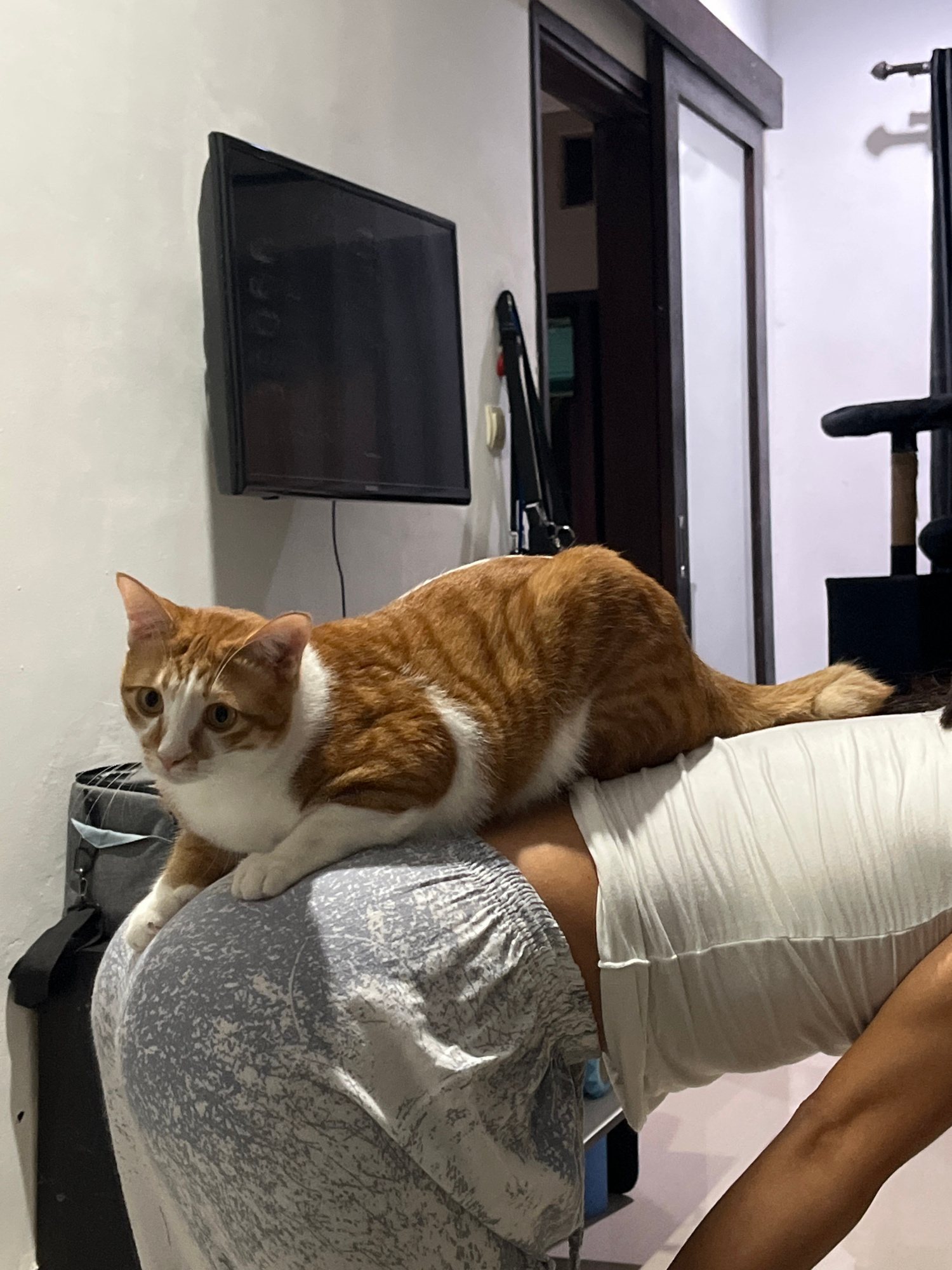 An orange and white tabby cat is captured in a domestic indoor setting, playfully clinging to a person's torso. The cat, with distinct orange stripes and white fur on its chest, belly, and parts of it…read more