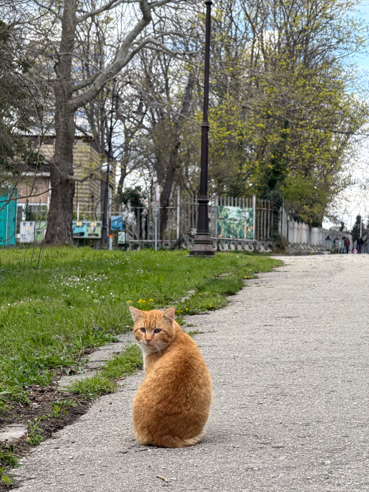 A ginger cat is sitting on the edge of a paved pathway in a park. The path is bordered by grass and trees. The scene appears to be located in a park within the city of Varna, Bulgaria. Behind the path…read more