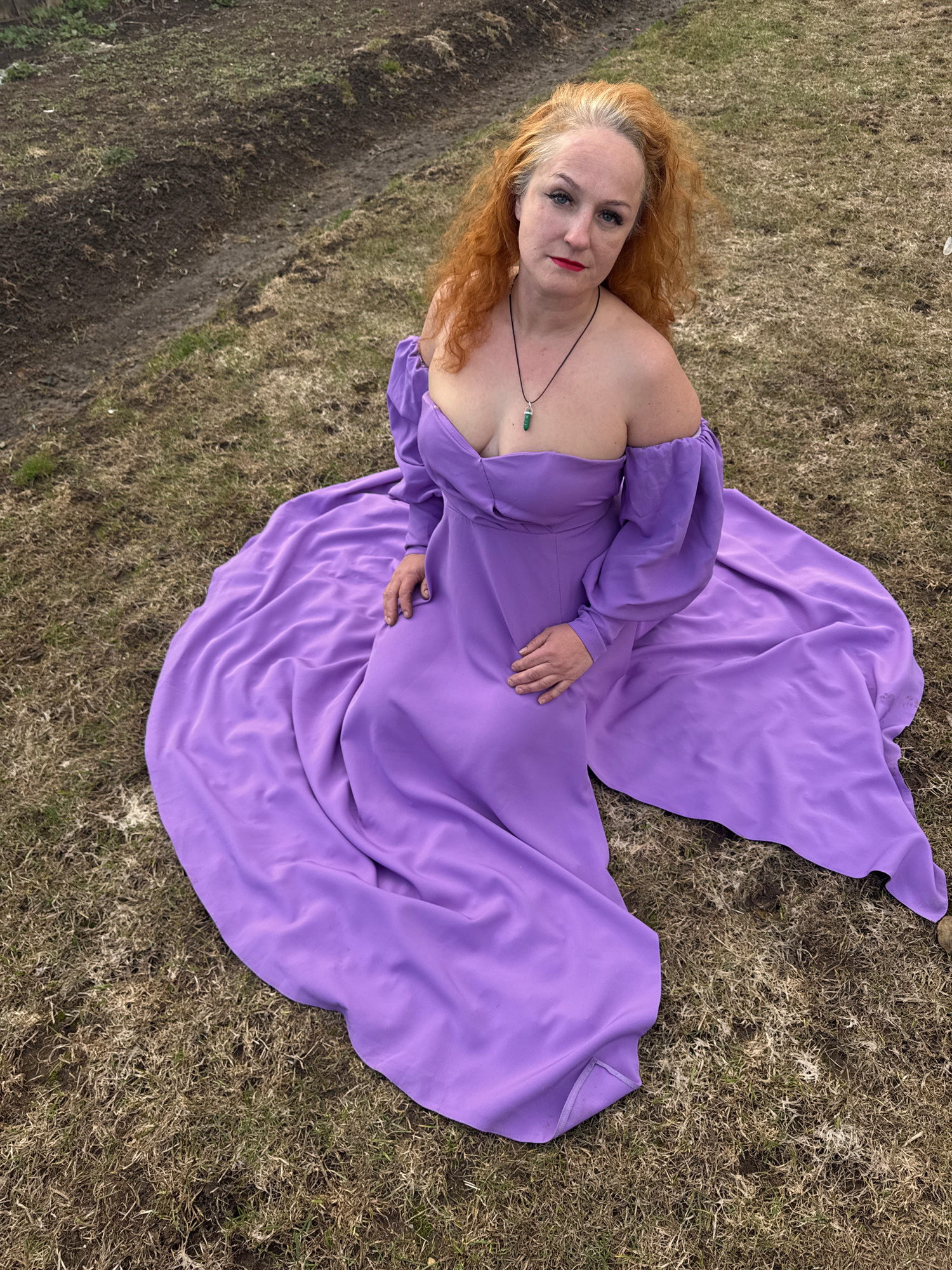 An outdoor, high-angle portrait captures a woman with reddish-blonde, curly hair lying or reclining on dry, sparse brown grass. She is wearing a long, off-the-shoulder, flowy purple dress with volumin…read more