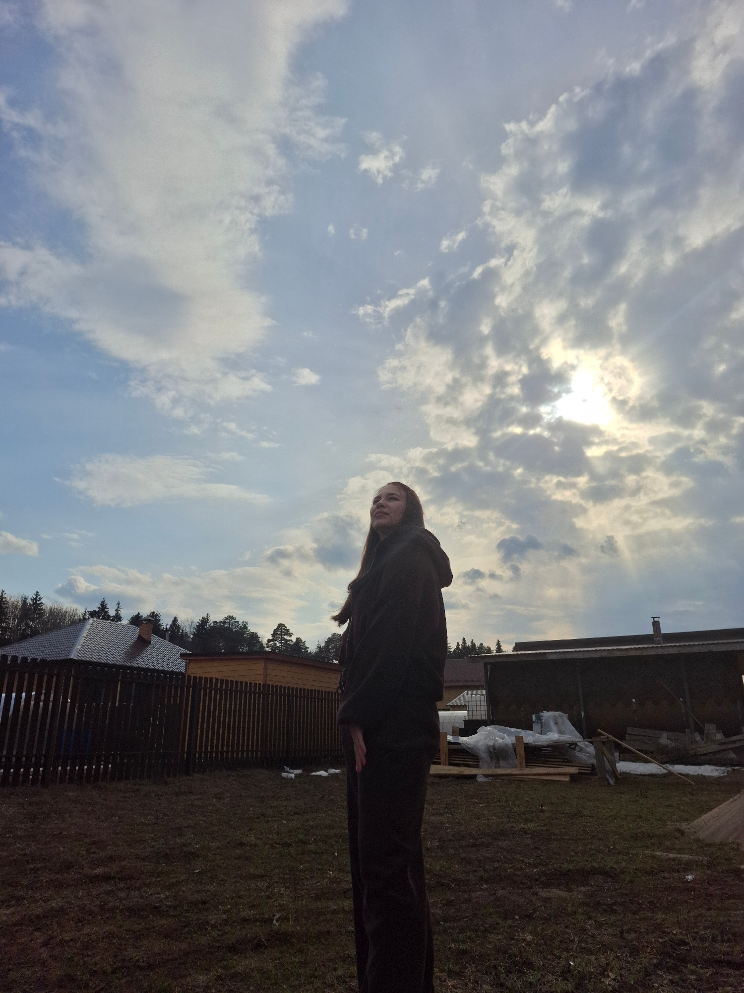 The image depicts a woman standing in a yard in Chaikovsky, Russia. The sky is cloudy with a visible sun. There are buildings, a fence, and grass visible in the background.