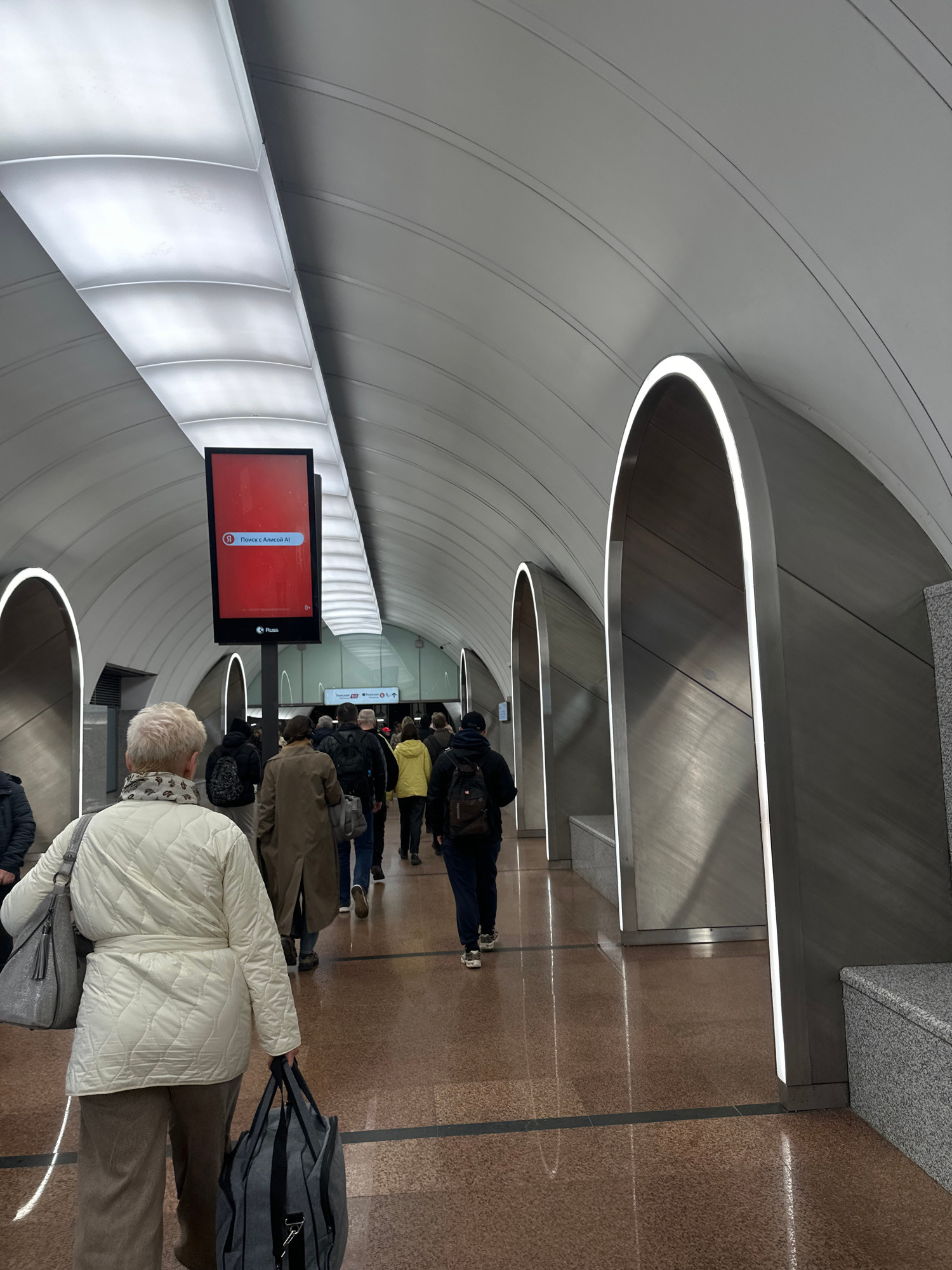 The image depicts a queue of people in what appears to be a modern, underground space, likely a subway station. The setting is suggested to be in Moscow, Russia based on the Russian language text visi…read more