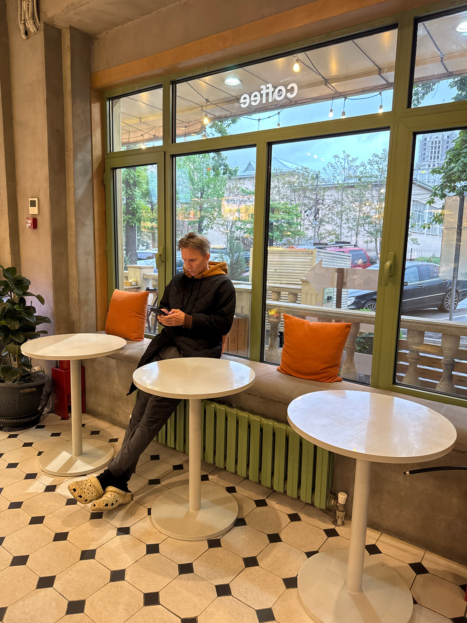This image, presented at a 90-degree clockwise rotation, captures the interior of a cafe or coffee shop in Bishkek City, Kyrgyzstan, with a view through large windows to an urban street scene. A sing…read more