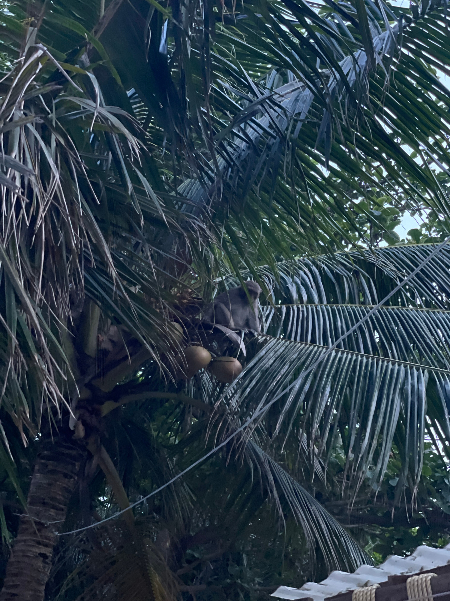 An adult macaque monkey is observed perched within the dense canopy of a coconut palm tree, located in the upper-mid left section of the frame. Its fur is predominantly light brown-grey. A second, par…read more
