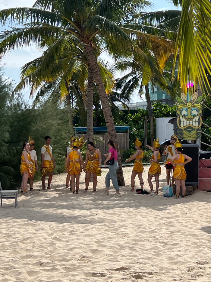 A beach scene features a row of dancers in yellow costumes with ornate headdresses. They stand on white sand next to palm trees, with a tiki-style decoration in the background. A person in pink stands…read more