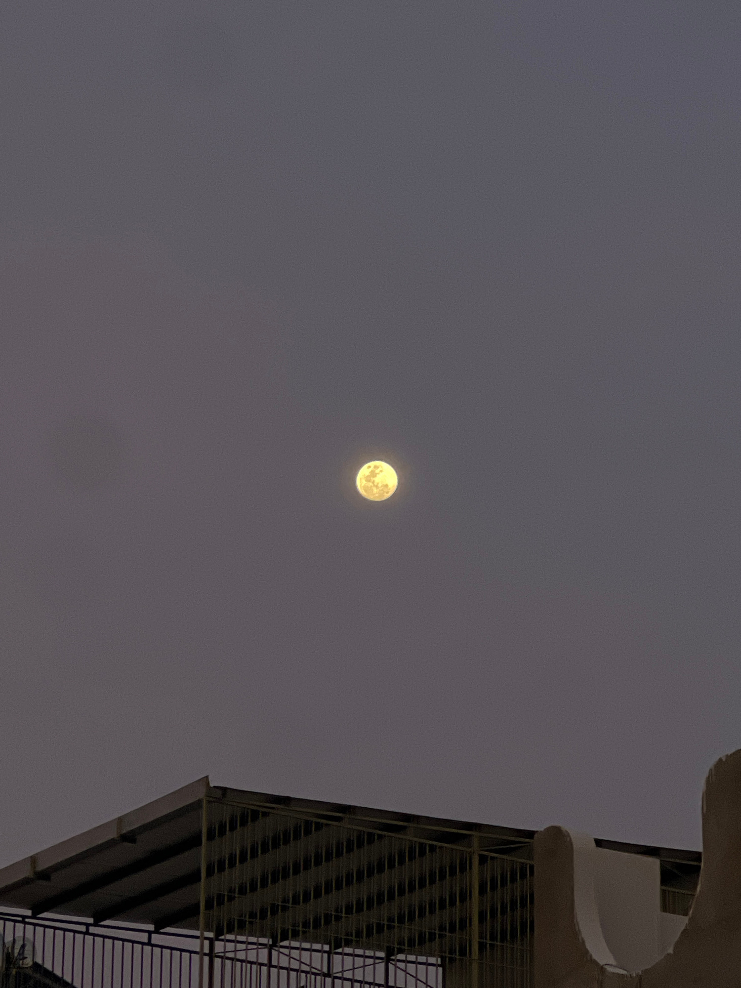 A low-angle shot shows a full moon in a gray sky. A building occupies the right side of the frame, with an angular, gridded structure, possibly a fire escape or external staircase, visible against the…read more