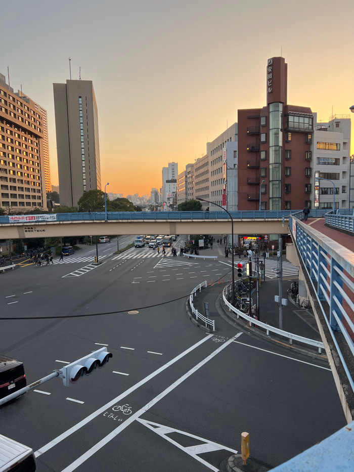 An elevated view captures a Japanese city street at dusk. Buildings line the left side, silhouetted against an orange sky. A roadway below features multiple lanes, white markings, and a designated bic…read more