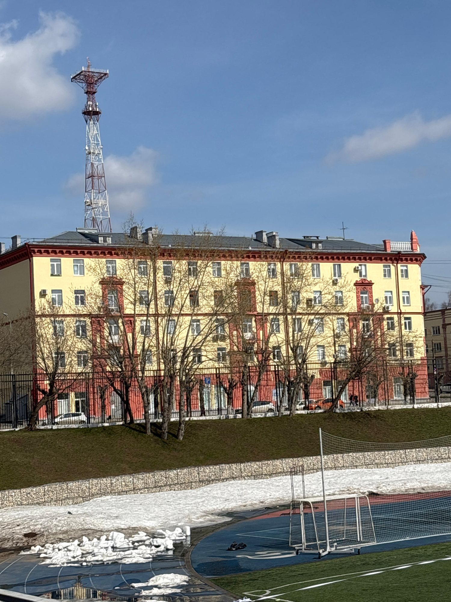 The image shows a view of a city scene, likely in Izhevsk, Russia, given the architectural style and context. The focal point is a tall, multi-story building with a yellow facade and red trim. It has…read more