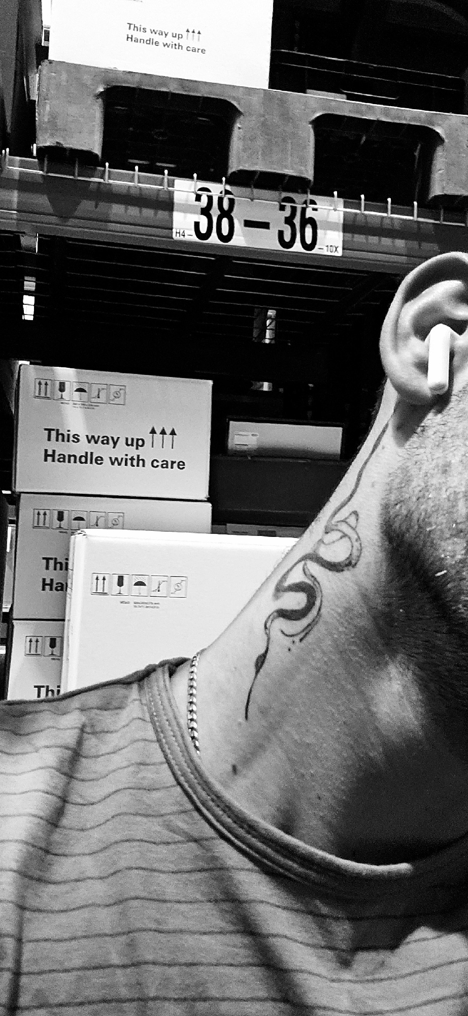 This black and white image captures a partial view of a person in what appears to be a warehouse or storage facility in Plovdiv, Bulgaria. The main subject is the upper left side of a person's torso,…read more