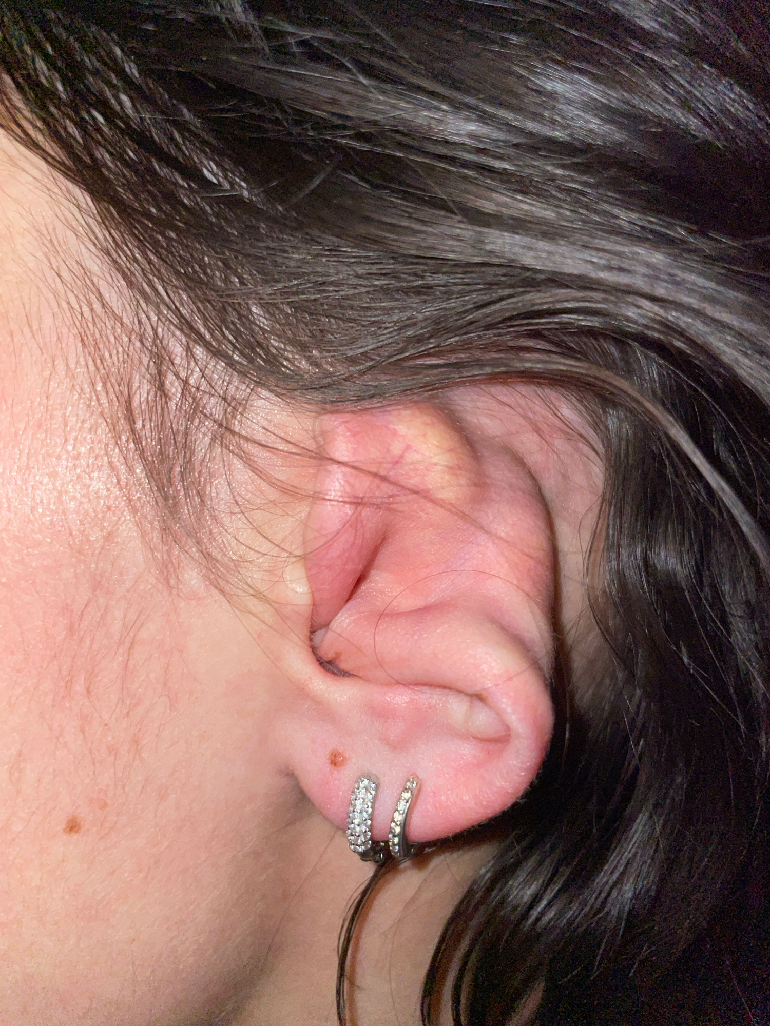 A close-up image depicts a person's ear adorned with a double conch piercing, each ring embellished with small stones. The earlobe and surrounding skin display various veins and capillaries. Short, da…read more