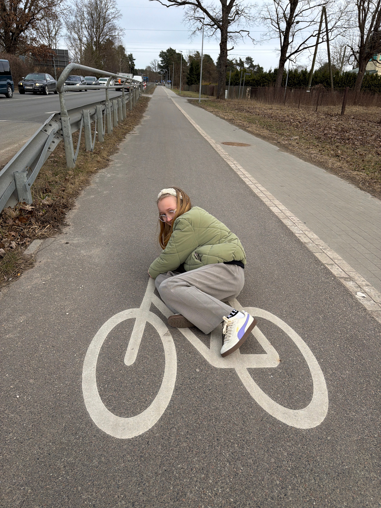 The image displays an outdoor scene in Dreiliņi, Latvia. A female subject is crouched on a dark grey asphalt bicycle path, positioned partially within a large white painted bicycle symbol. The subject…read more