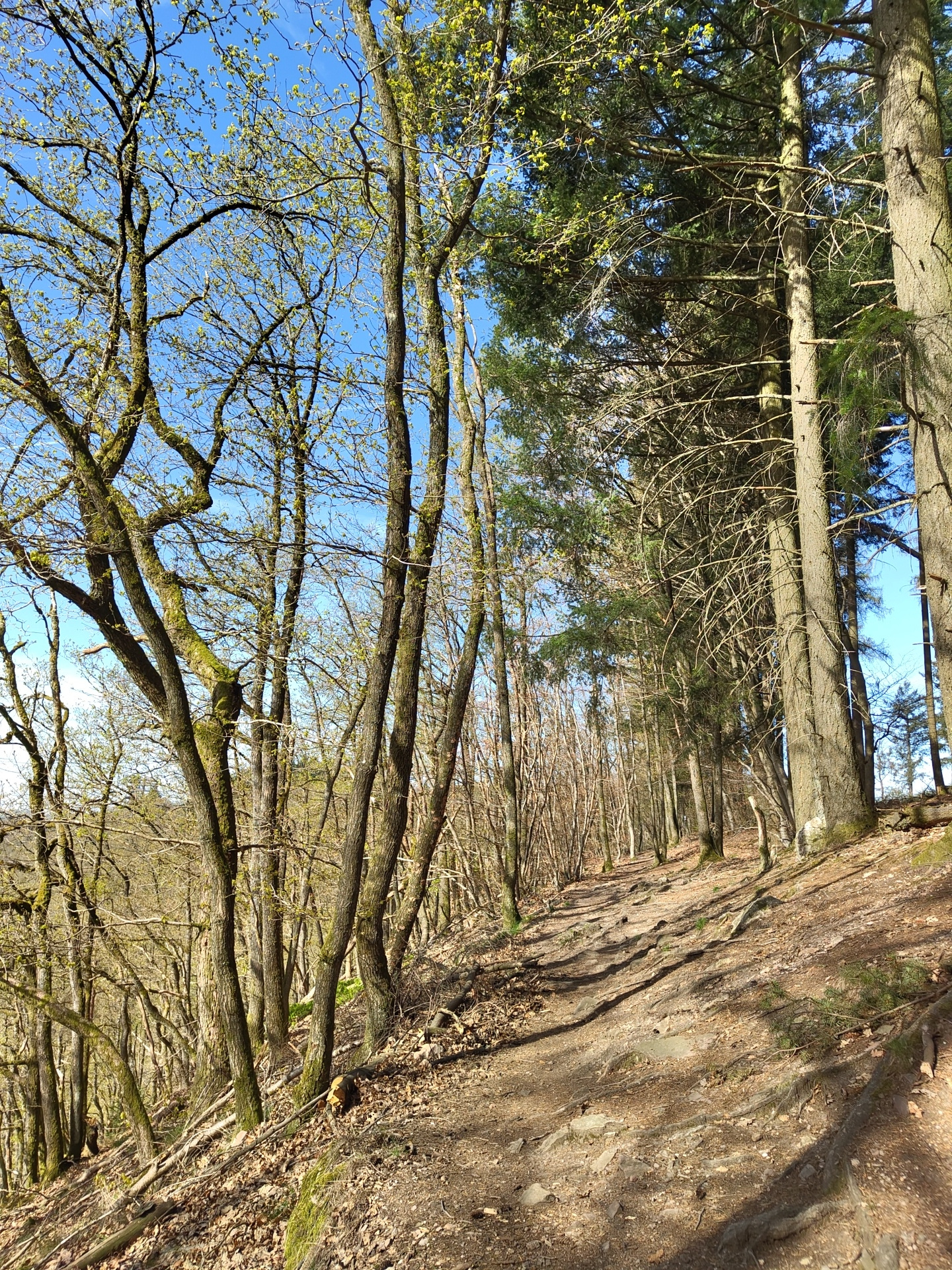 The image shows a forest landscape, likely in Mettlach, Germany. The trees are bare-branched with some budding leaves, suggesting early spring. The ground is covered in dry leaves and dirt. The sky is…read more