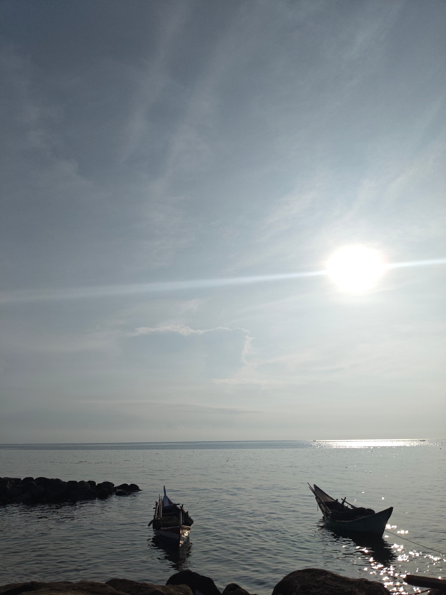The photograph depicts a coastal scene in Lhokseumawe, Indonesia, under a bright, hazy sun. The sky is predominantly light blue with thin cloud cover and a visible sun flare. The sea is calm with refl…read more