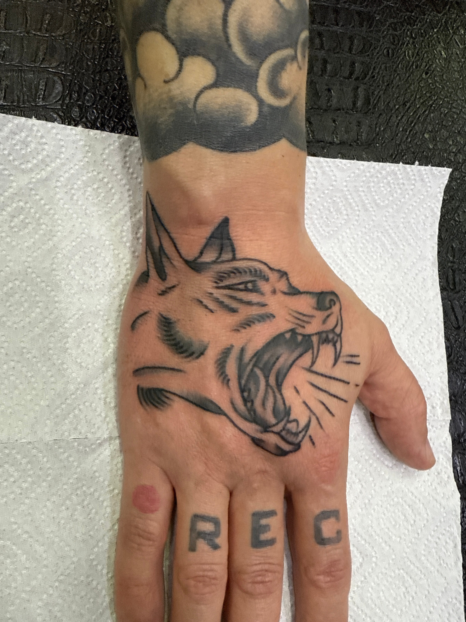 A close-up photograph shows a person's left hand with tattoos. The hand is placed on a white paper towel. The hand displays multiple tattoos: a roaring wolf head on the back of the hand, the letters "…read more