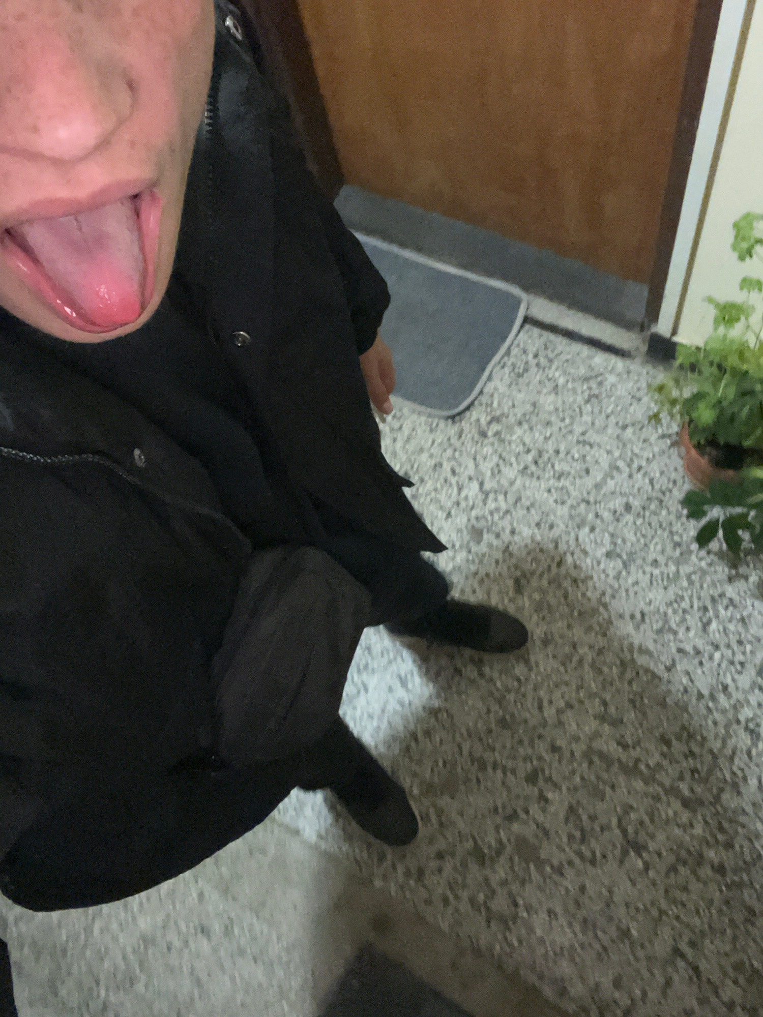 The image captures a high-angle, downward-facing perspective, featuring a person from the chin downwards, along with their lower body and feet. The person is dressed in black attire, including a jacke…read more