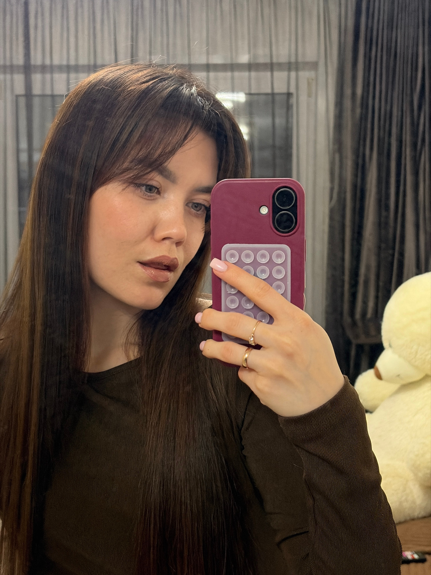 A selfie is taken indoors by a woman with long brown hair and light skin. She holds a maroon cell phone case with a grid of small, clear suction cups and two camera lenses. Two gold rings are visible…read more