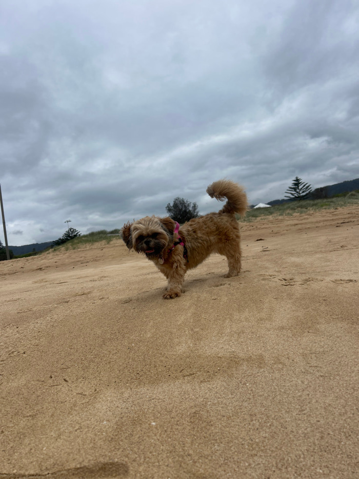 A small, furry dog with a curled tail stands on a sandy beach under a cloudy sky. The dog, possibly a Shih Tzu mix, is facing the camera and wears a pink collar. Behind the dog, there is grassy terrai…read more