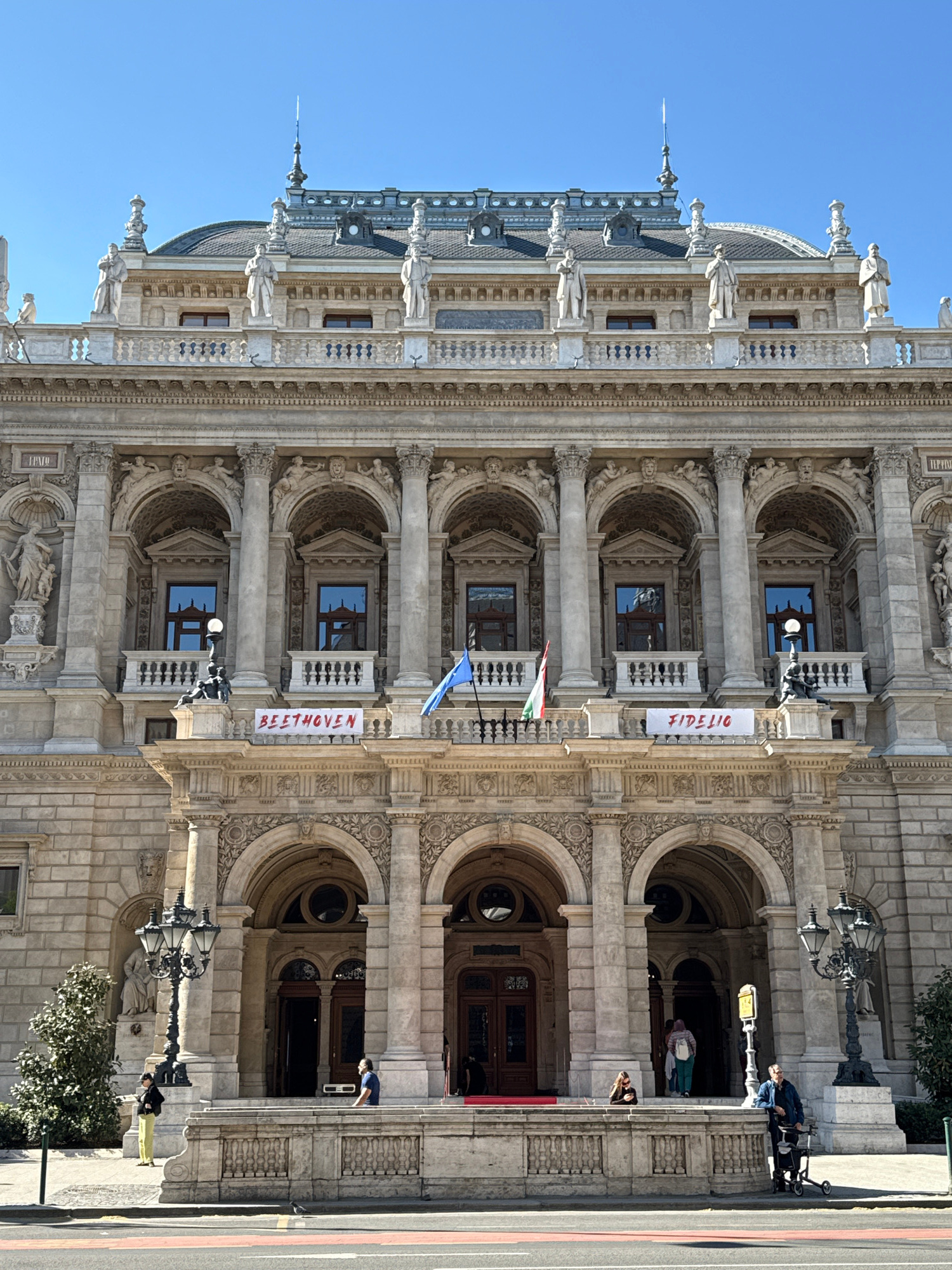 The image shows the exterior of a building in Budapest, Hungary, featuring classical architecture with columns, arches, and ornate detailing. Banners hanging from the building display the words "BEETHβ¦read more