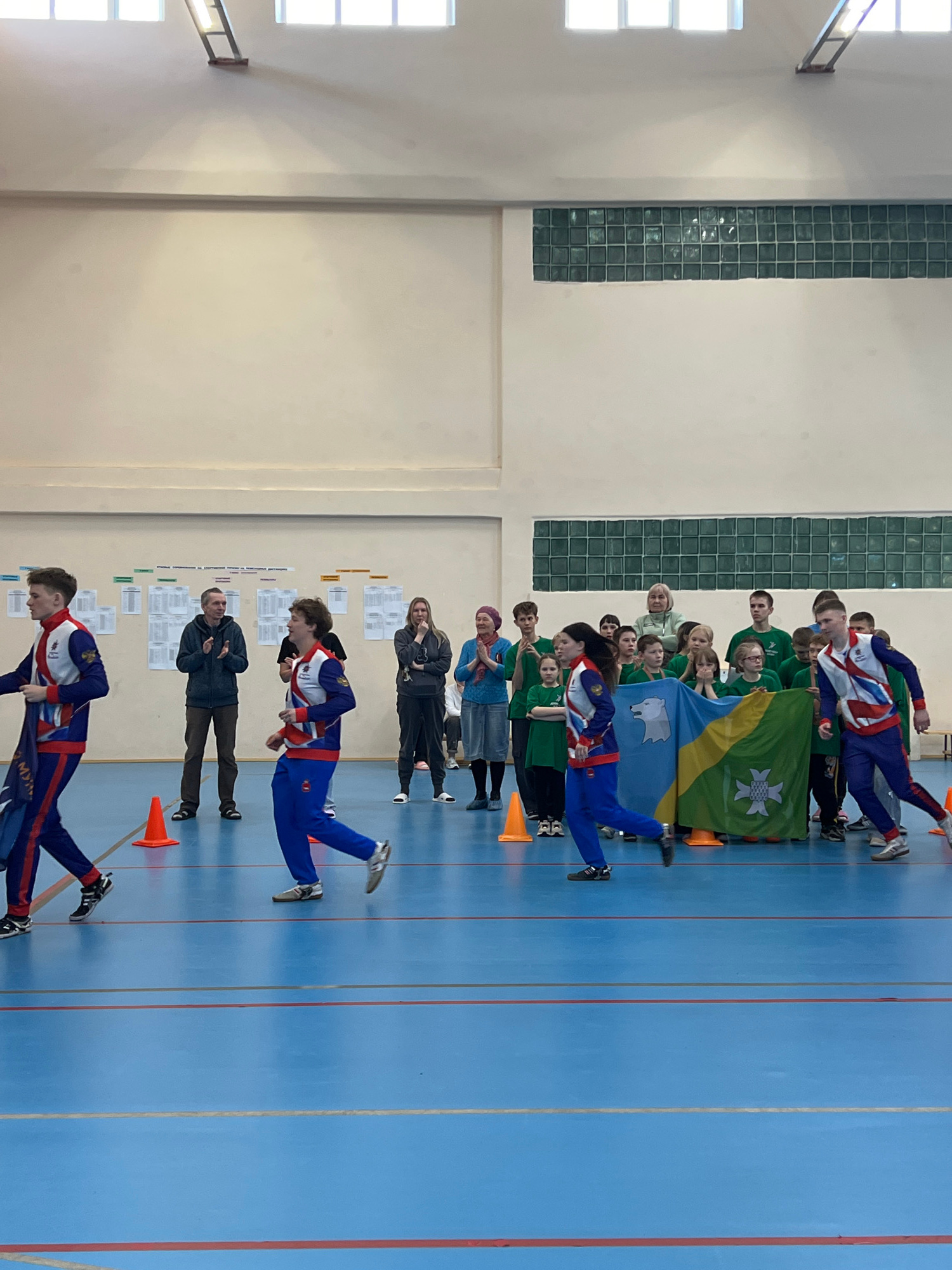 The image depicts a group of people in what appears to be an indoor sports facility, possibly a gymnasium. The location is likely in Berezniki, Russia, based on the flag design that is held by some of…read more