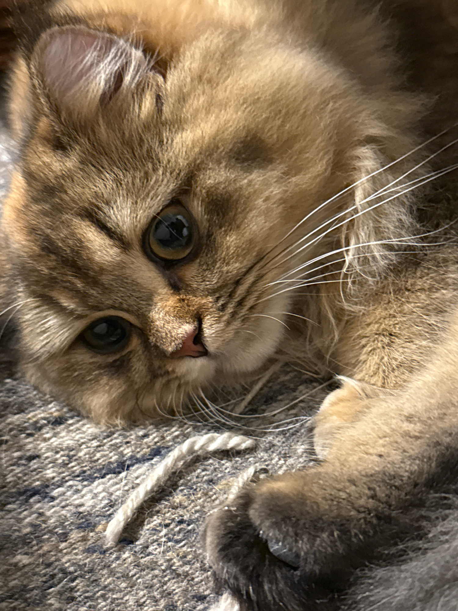 A tan and grey cat with green eyes lies on a grey and white woven blanket. The cat's head is tilted, and its whiskers are visible. The cat's paw is visible. The location is unknown and cannot be deter…read more