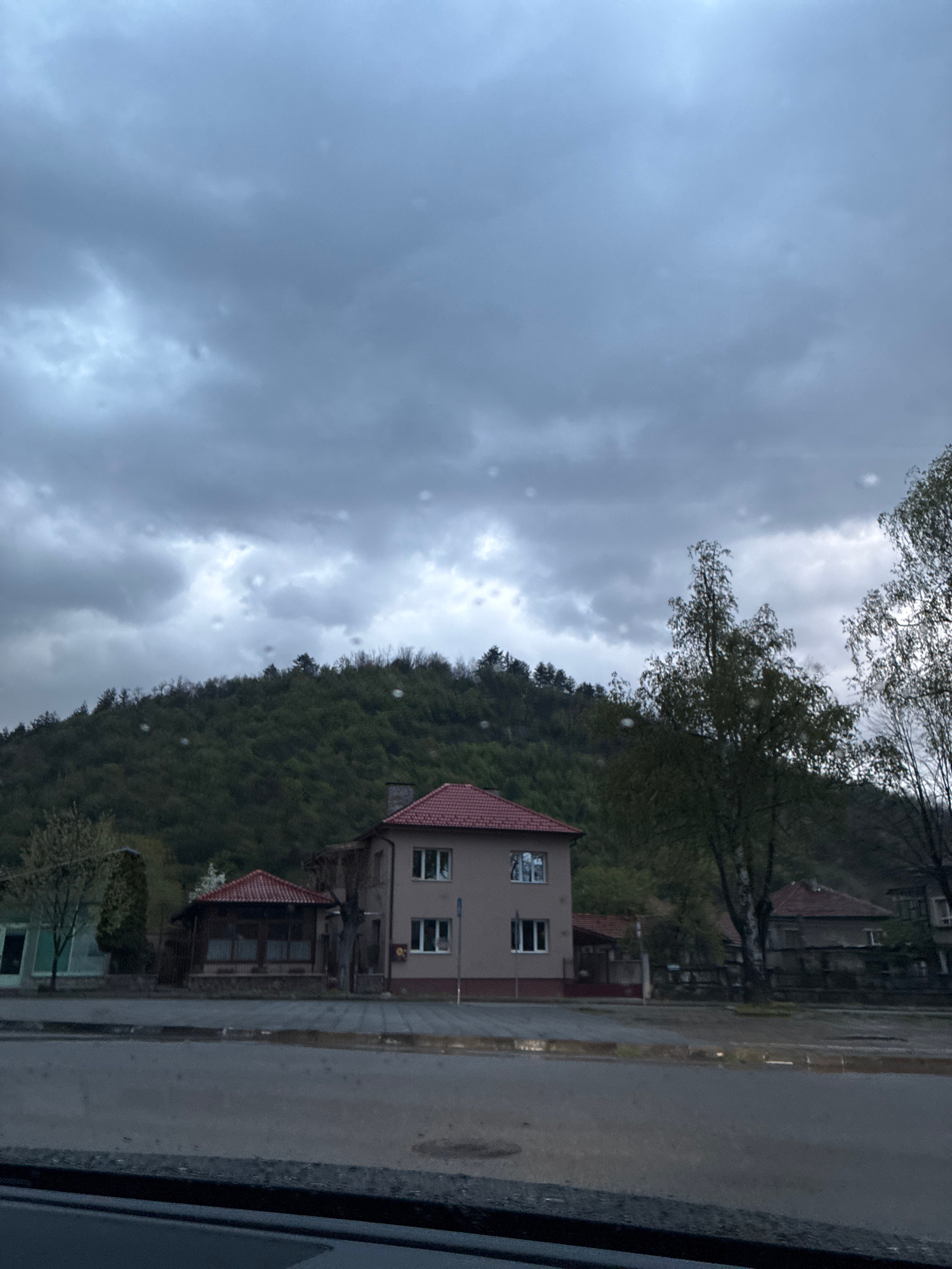 The image shows a street scene in Berkovitsa, Bulgaria on an overcast day. A two-story, light brown building with a red tile roof is set against a backdrop of a densely forested hillside. A smaller, d…read more
