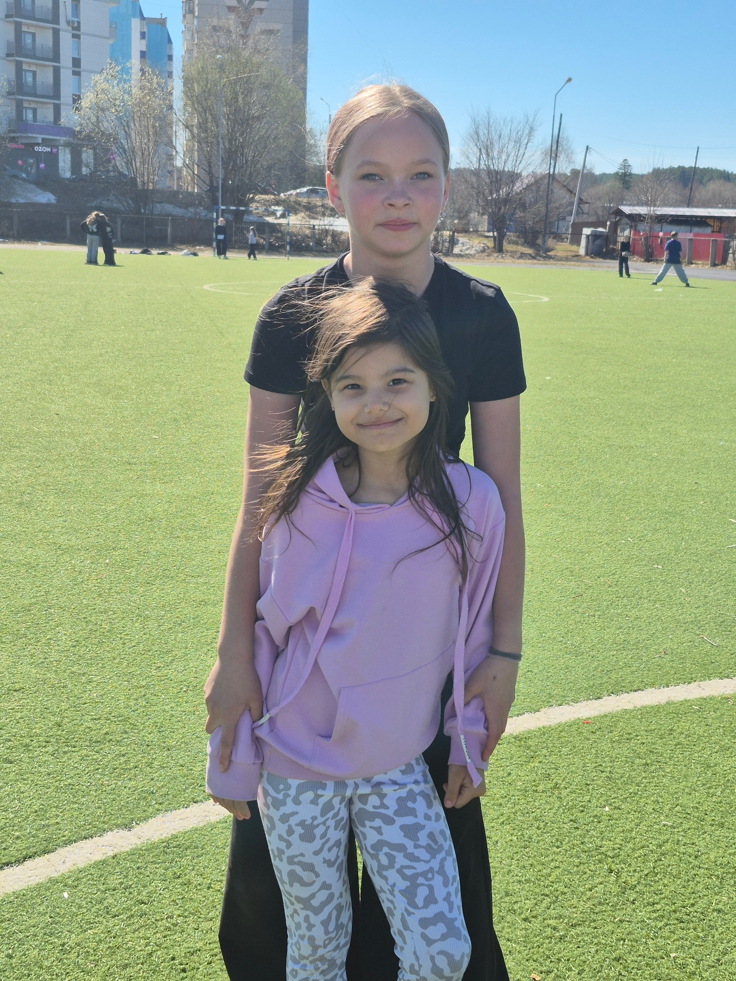 Two young girls pose on a green field under a bright sky. One girl wears a black shirt and the other is in a light purple hoodie and patterned leggings. The location appears to be a recreational area…read more