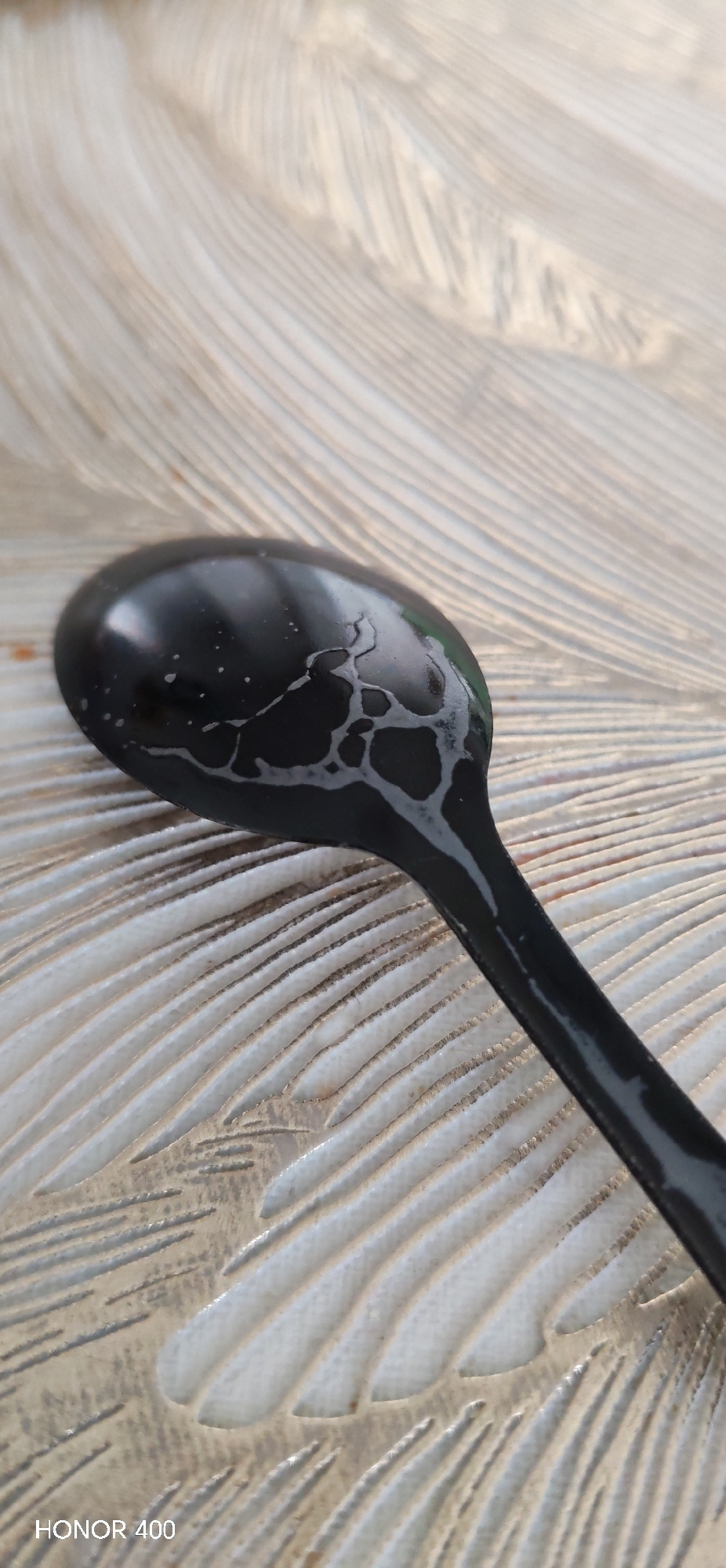 A close-up shot shows a black spoon resting on a surface with a textured, feather-like pattern. The spoon is slightly wet with visible water droplets and a network of water marks on its surface. The b…read more