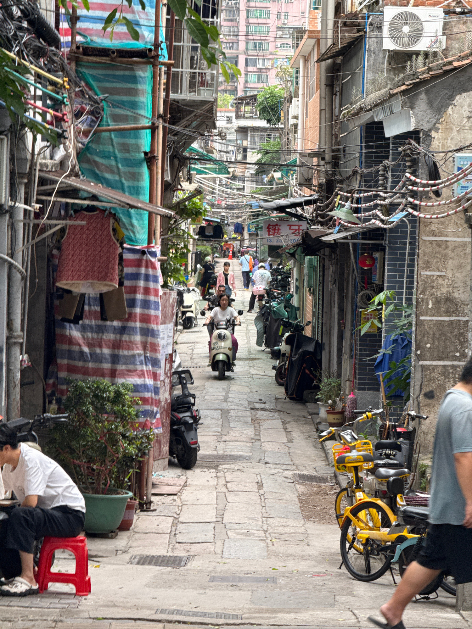 The image shows a narrow, congested alleyway in what appears to be Liwan District, China. The alley is paved with rectangular stone blocks. Along the alley's length, numerous parked motorbikes and sco…read more