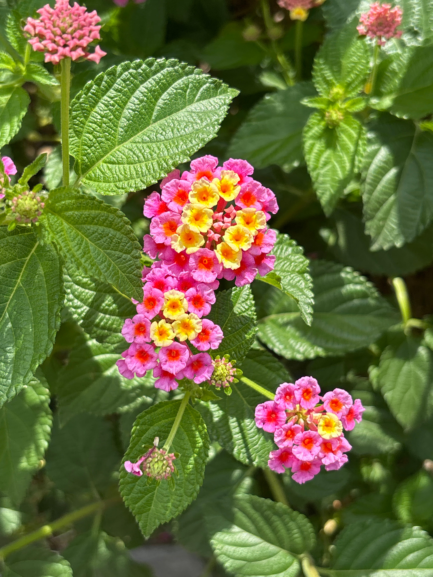 The image shows a close-up of a Lantana plant with clusters of pink, yellow, and orange flowers amidst green leaves. The textured leaves show detailed venation. The photo appears to have been taken du…read more