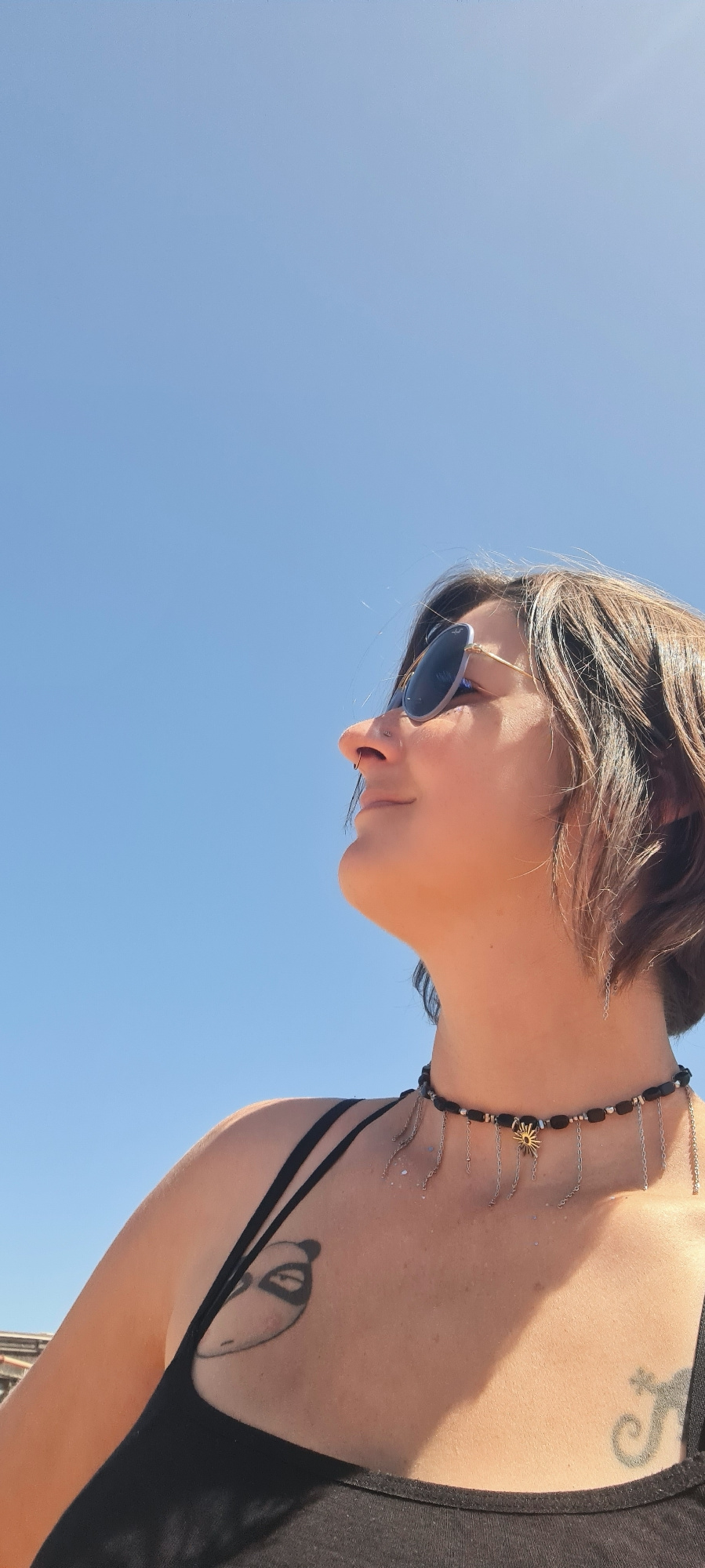 A woman with short brown hair is wearing sunglasses and looking down. She has a nose ring and a necklace. She is wearing a black tank top. There is a tattoo on her upper chest, another on her shoulder…read more