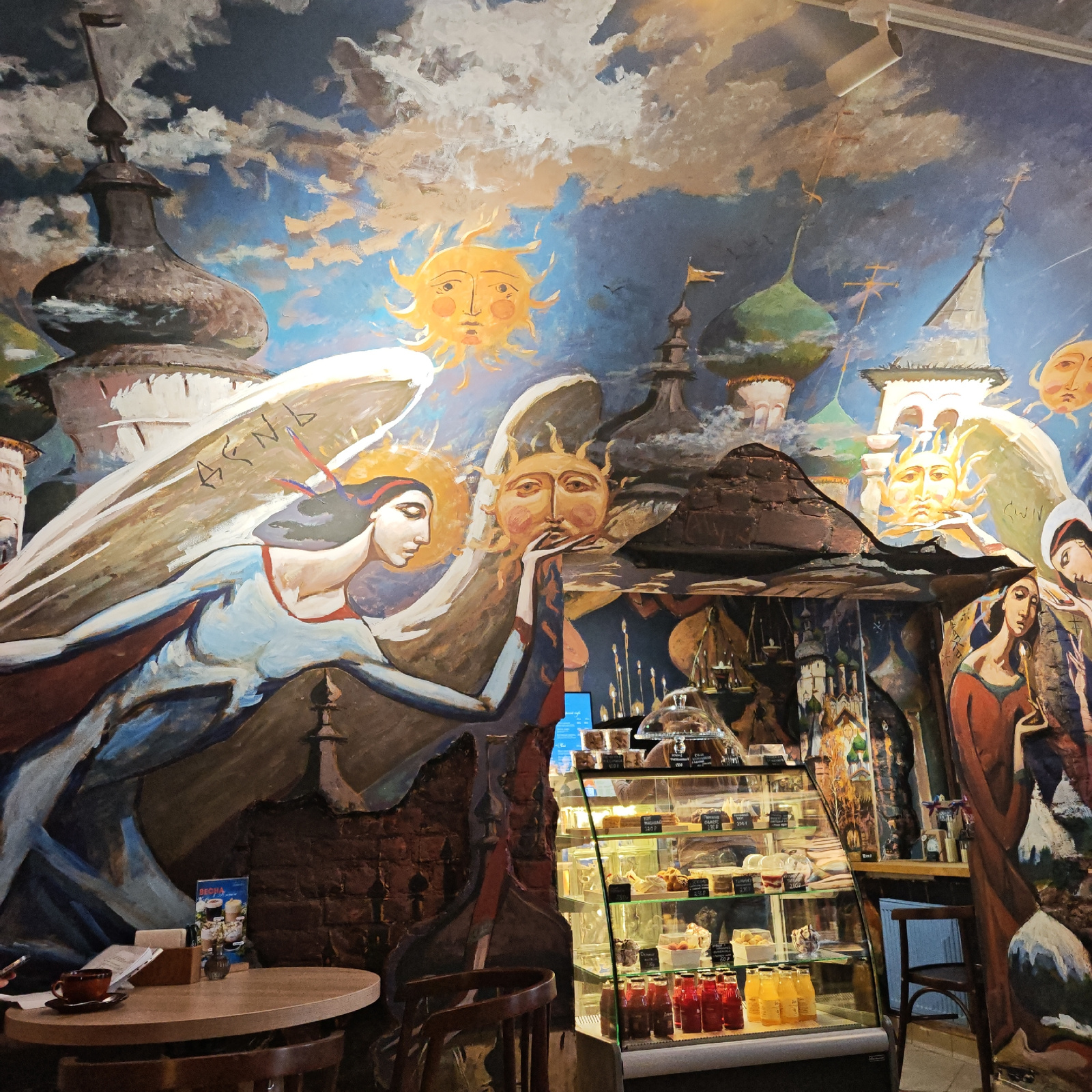 The image shows the interior of a cafe in Rostov, Russia. The walls are adorned with a large, mural-style painting featuring angels, stylized suns, and towers reminiscent of Russian architecture. A wo…read more