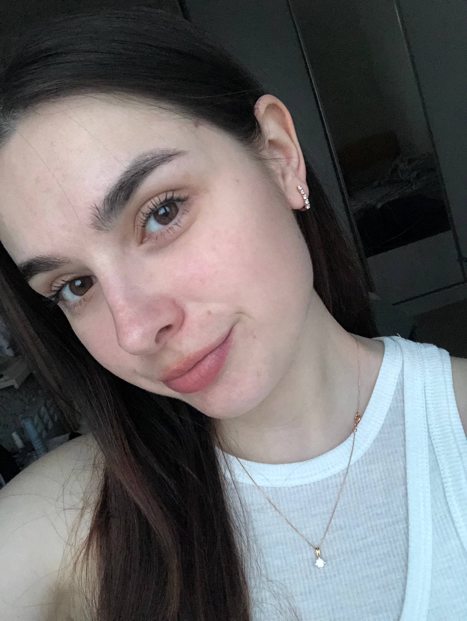 A close-up, slightly angled selfie shows a woman with fair skin and brown hair. She is wearing a white tank top and a delicate gold necklace with a small diamond pendant. Her left ear has a bar-shaped…read more