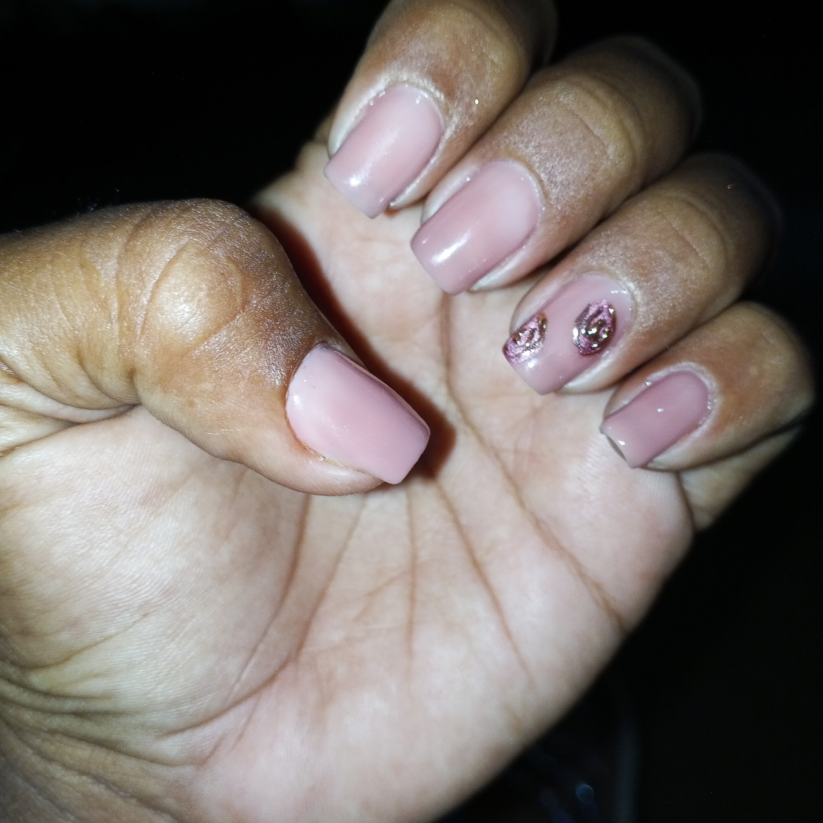 A close-up image shows a dark-skinned hand with manicured fingernails. The nails are painted a light, dusky rose color, with one nail on the right hand adorned with glittery embellishments in two smalβ¦read more