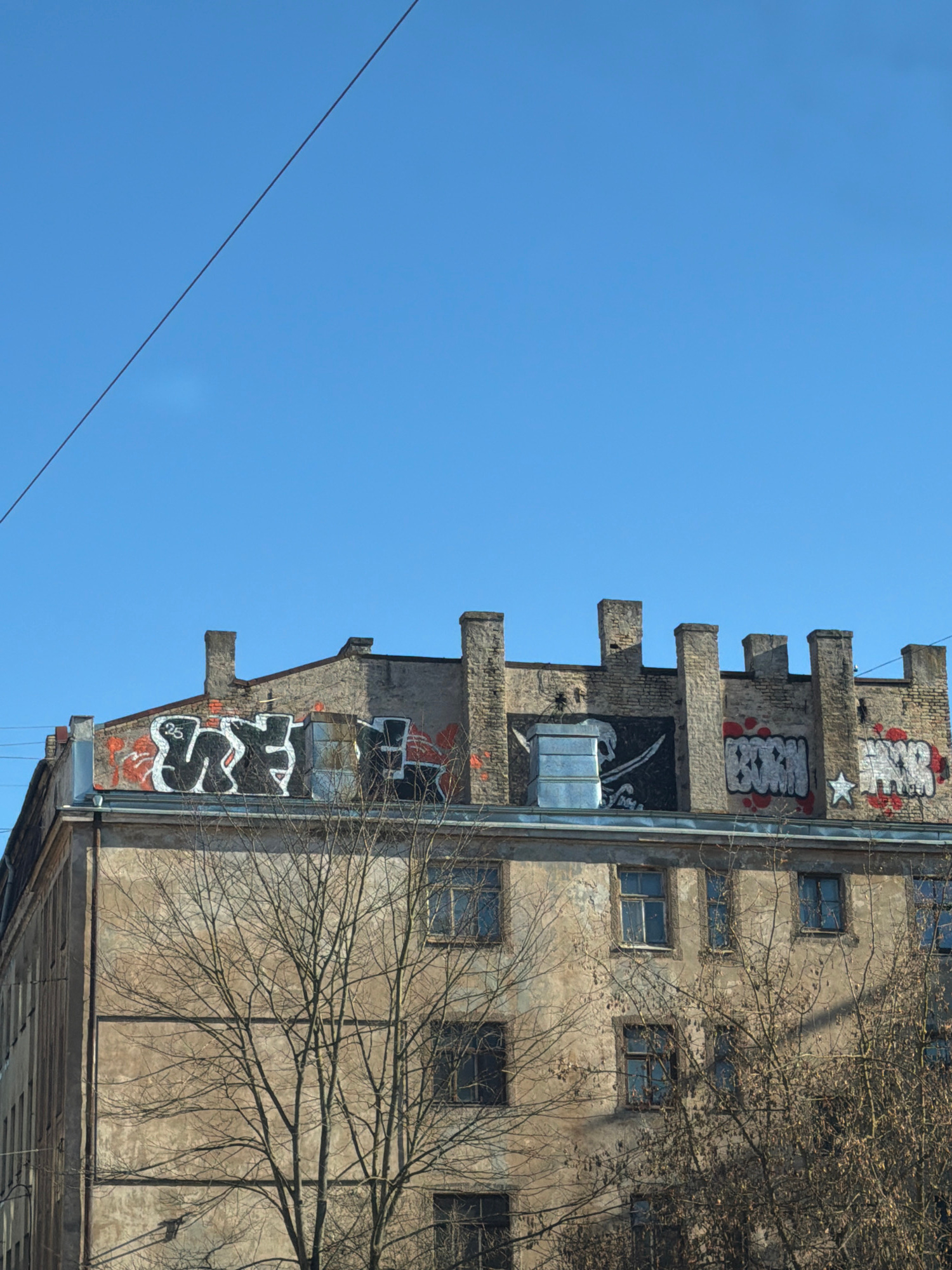 The image shows a low-angle view of a weathered building in Riga, Latvia, against a clear blue sky. The building is characterized by a concrete facade, with graffiti covering several sections. The bui…read more