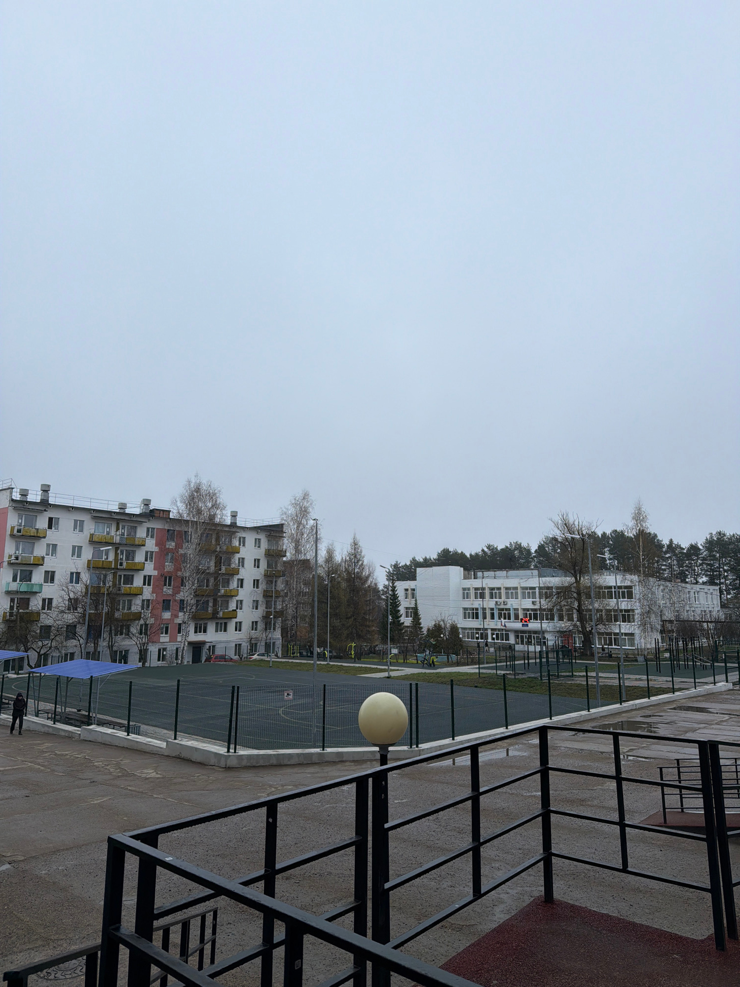 This image, taken in Chaikovsky, Russia, depicts an outdoor urban setting under an overcast sky. The scene is bisected by a long, grey horizon, separating a vast expanse of light grey sky from the low…read more