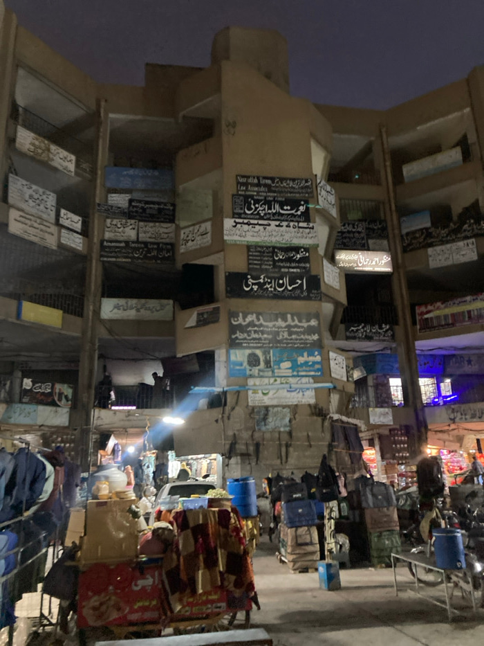 This nighttime image captures a busy commercial street scene in Quetta City Tehsil, Pakistan, centered on a multi-story building. The building's light-colored, angular facade is densely covered from t…read more