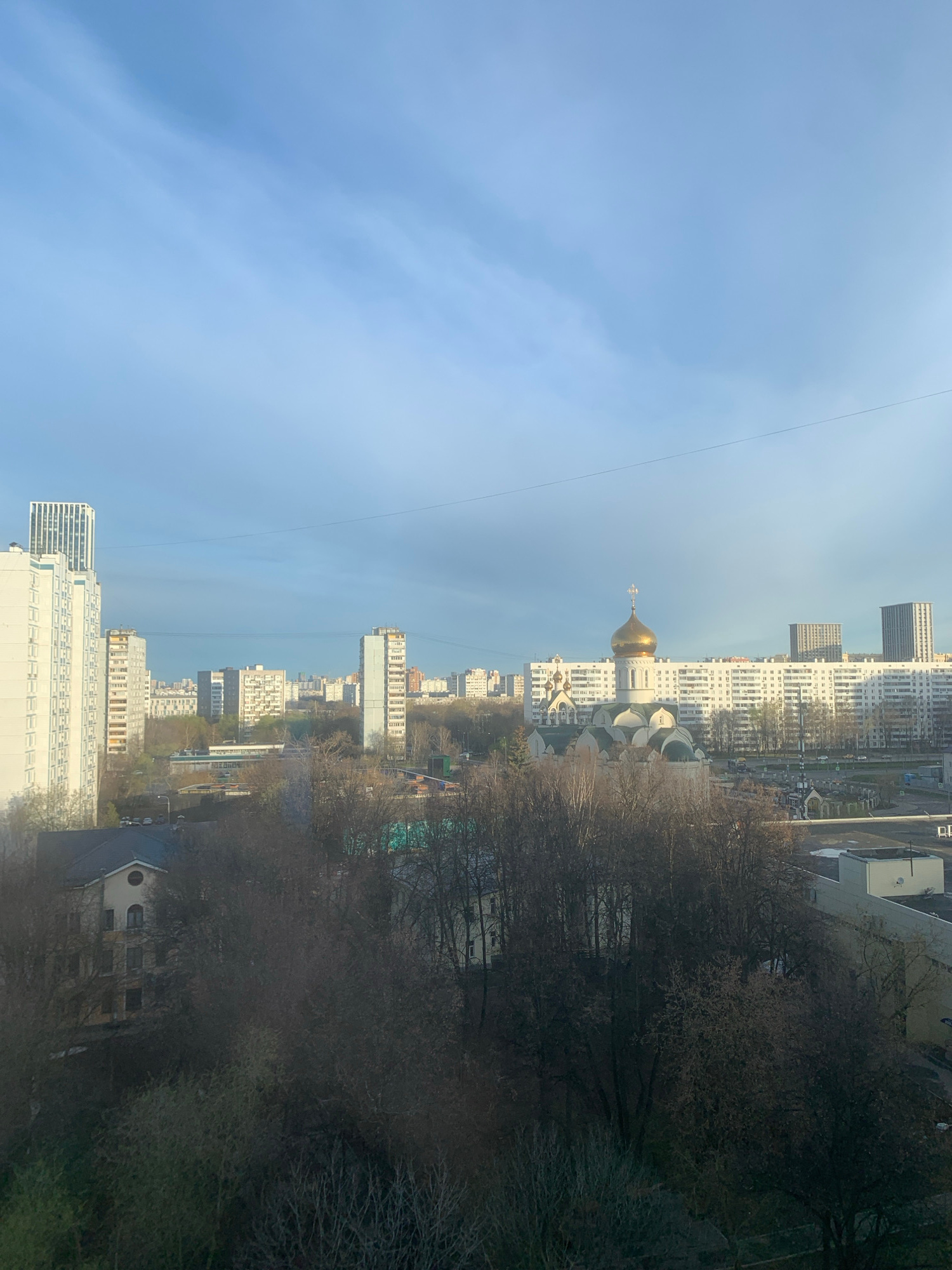 The image shows a cityscape in Moscow, Russia, under a partly cloudy sky. A prominent feature is the Cathedral of Christ the Savior, recognizable by its golden dome. The surrounding area includes vari…read more