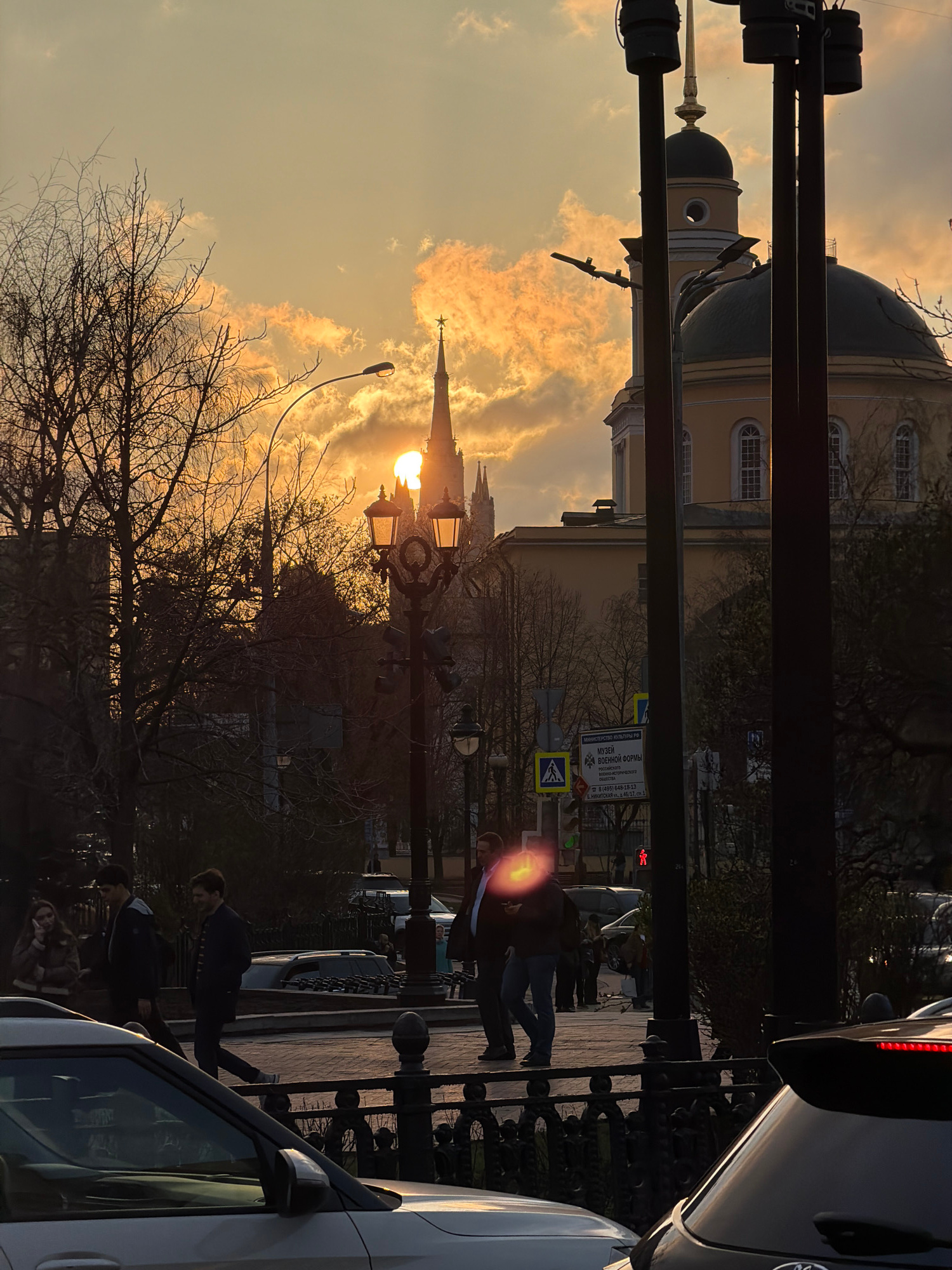 This image captures an urban street scene in Moscow, Russia, during what appears to be a vibrant sunset or sunrise. The low-lying sun casts a warm, golden light across the sky, illuminating scattered…read more