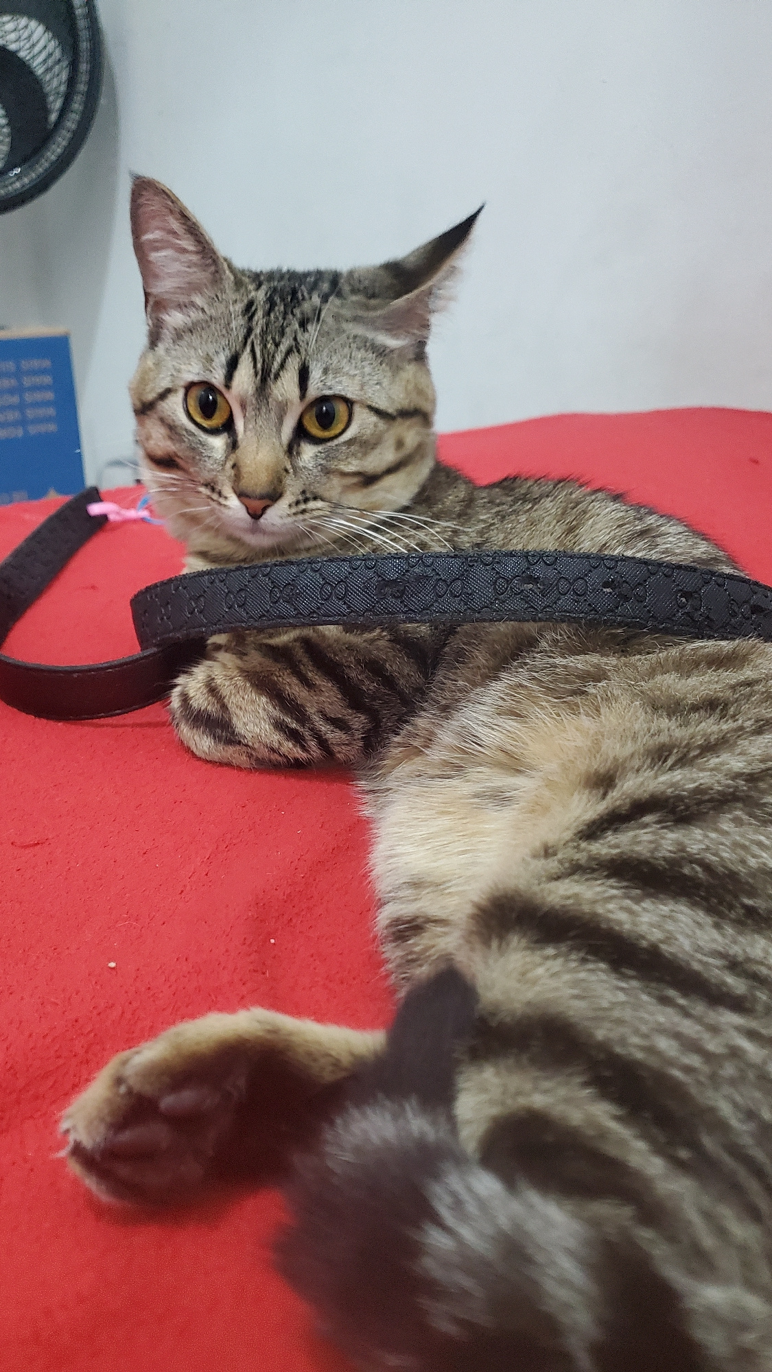 A tabby cat with yellow eyes is lying on a red surface, with a black and brown patterned strap draped across its body. The cat's head is turned towards the camera. A blue book and a fan are partially…read more