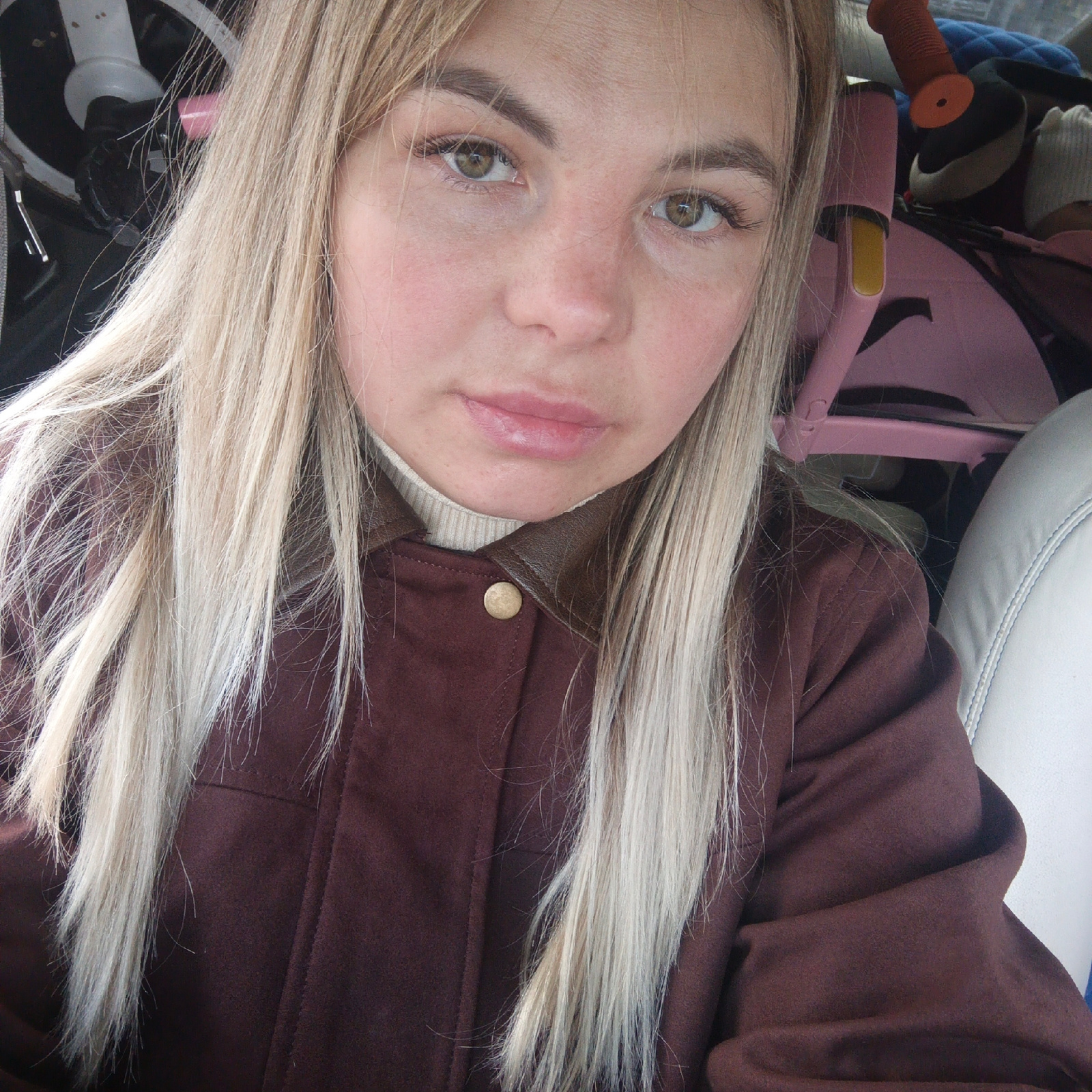 A woman with long blonde hair and a brown jacket is sitting in a vehicle. Her hair is parted in the middle and falls over her shoulders. She is wearing a brown jacket with a leather collar and a butto…read more