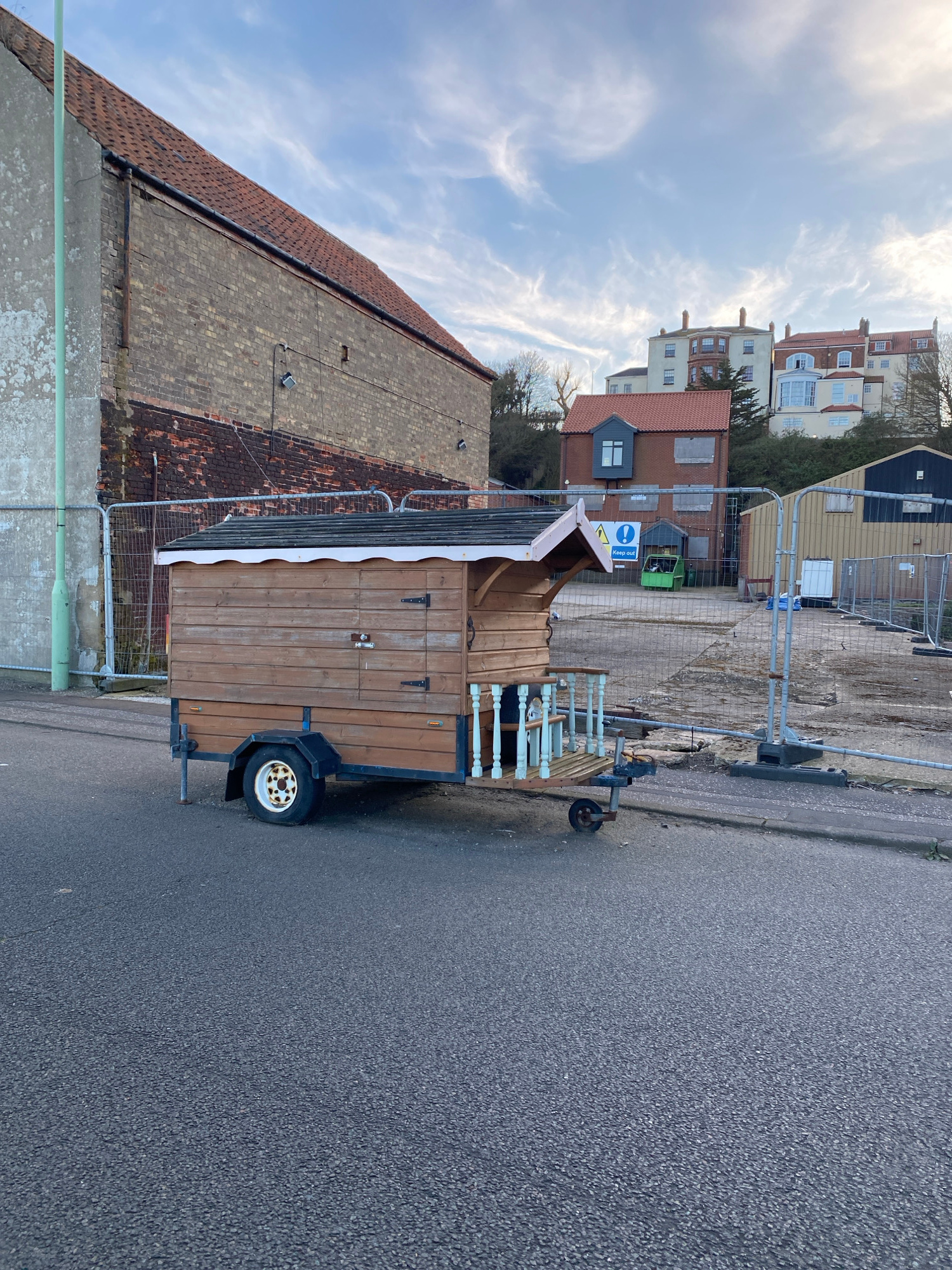 A wooden shed-like structure on a wheeled trailer sits on an asphalt road adjacent to a weathered brick building with a pitched roof. A temporary metal barrier separates the structure from the buildin…read more