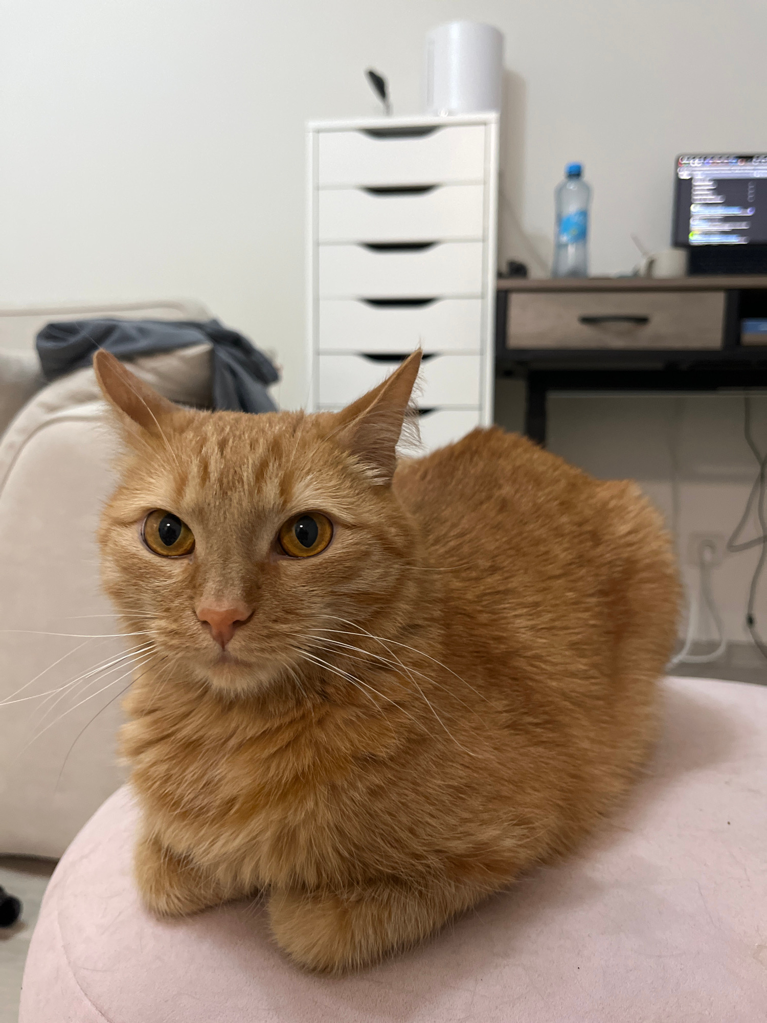 An orange-furred cat is the central subject of this indoor scene, positioned in the upper-right portion of the frame and gazing directly at the viewer. The cat has bright amber eyes with dilated black…read more