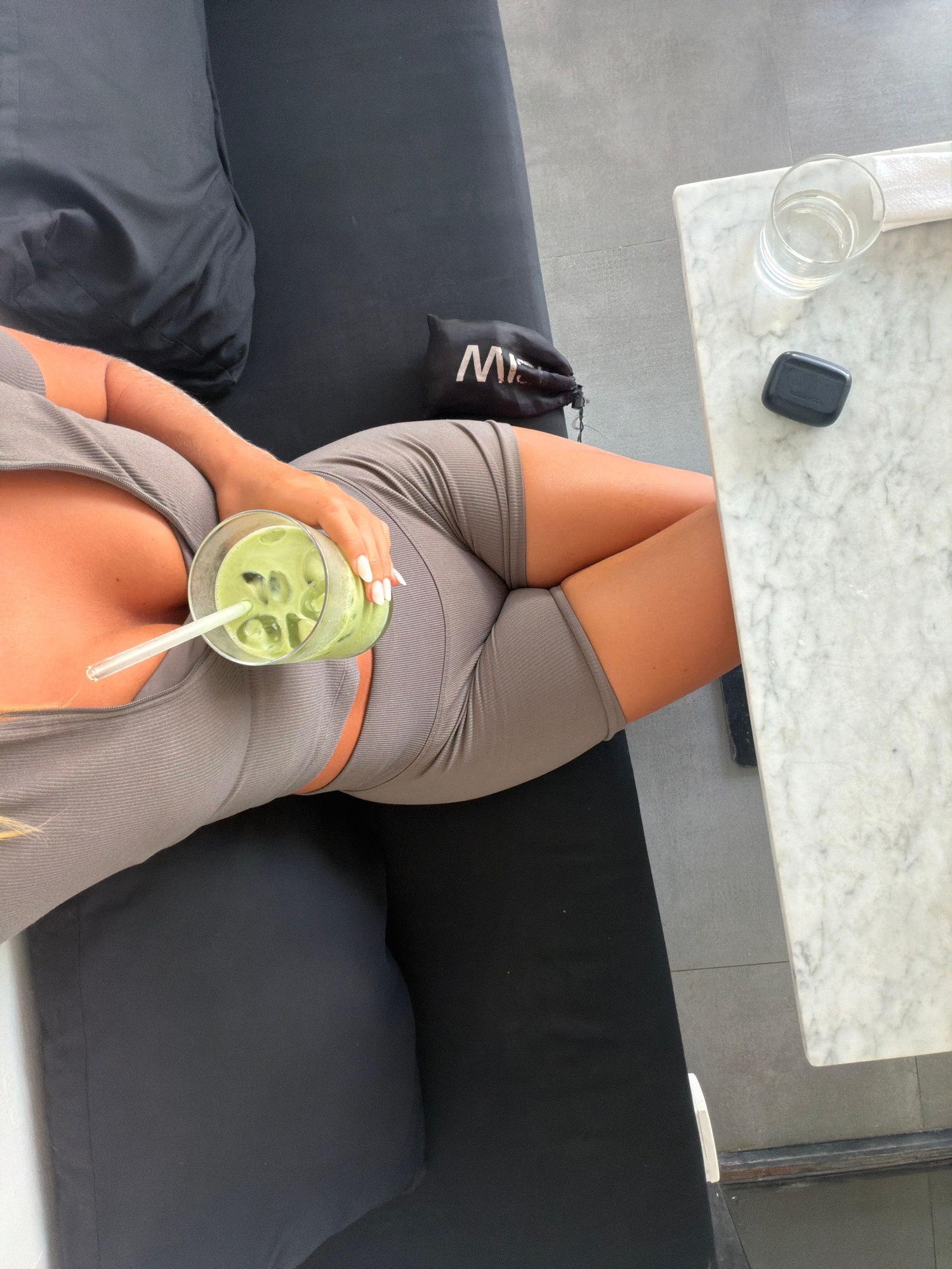 This overhead shot presents a person relaxing in a modern lounge setting. The subject, likely female, is viewed from the chest down, reclining on a black sofa or couch with their legs crossed. They ar…read more