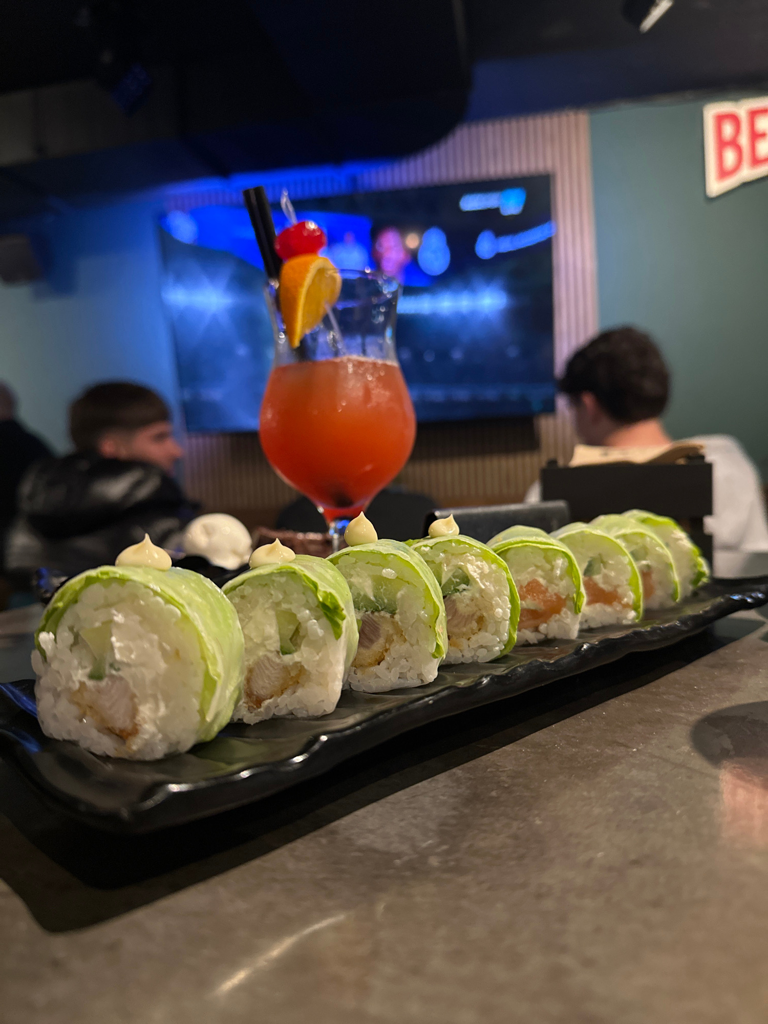 The image shows a close-up of a platter of sushi rolls and a cocktail on a reflective surface, seemingly a table. The sushi rolls are wrapped in lettuce instead of seaweed and topped with a small doll…read more