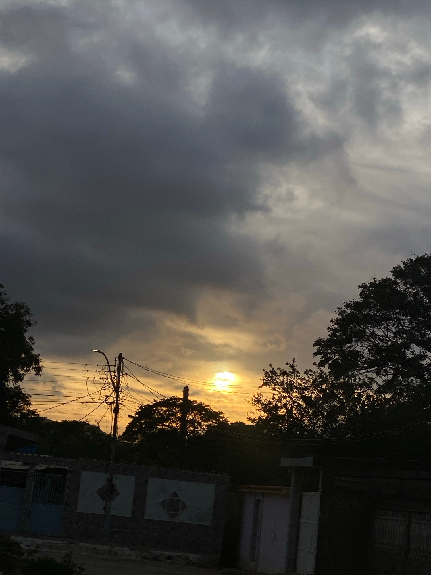 The image depicts an outdoor street scene in Juan Griego, Venezuela, at either sunrise or sunset. The sky, occupying the upper two-thirds of the frame, features dense, dark gray clouds in the upper le…read more