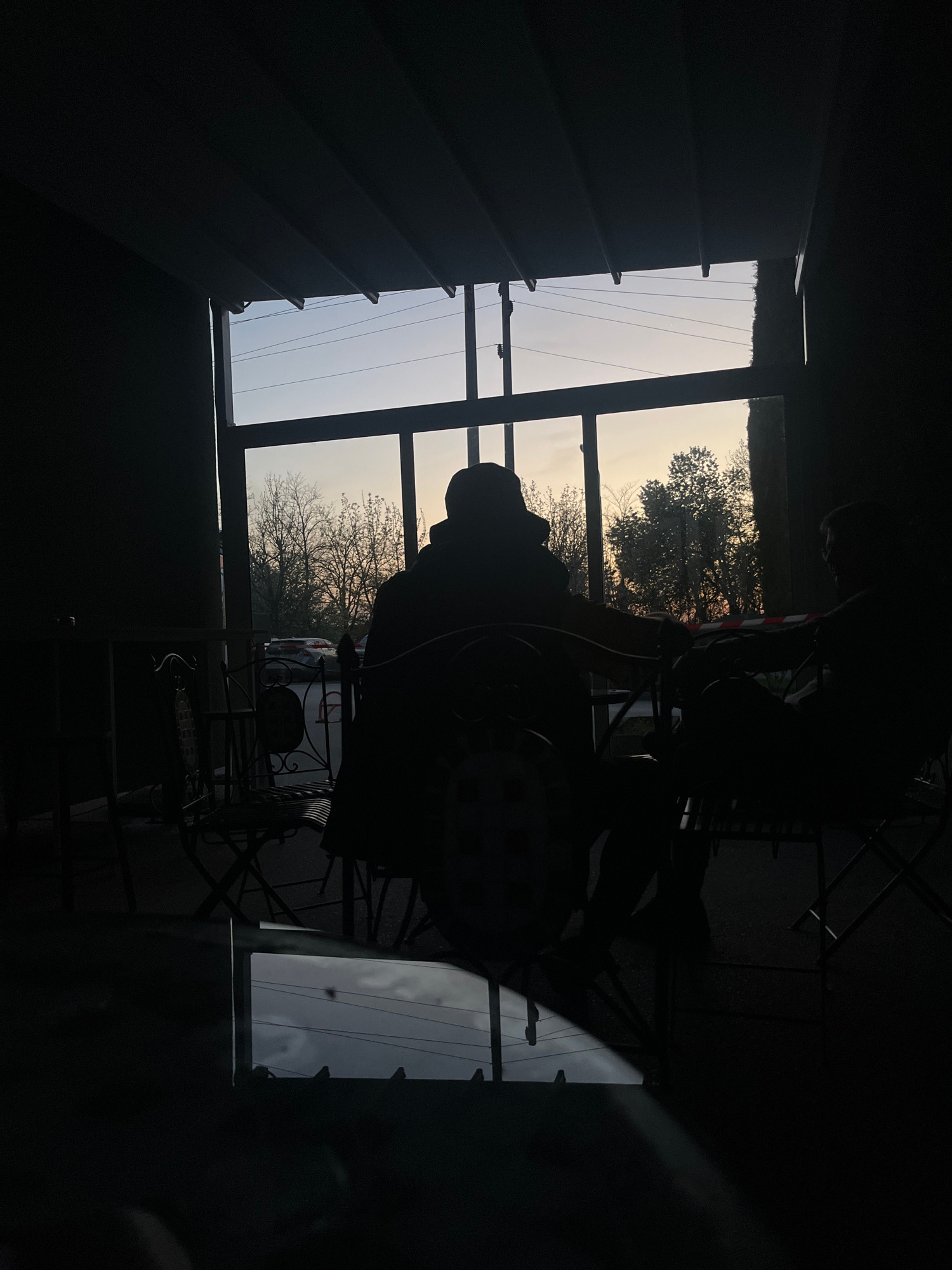 The image captures a high-contrast scene from an interior space looking out through a large window or glass door. The interior is profoundly underexposed, rendering its subjects in deep silhouette aga…read more