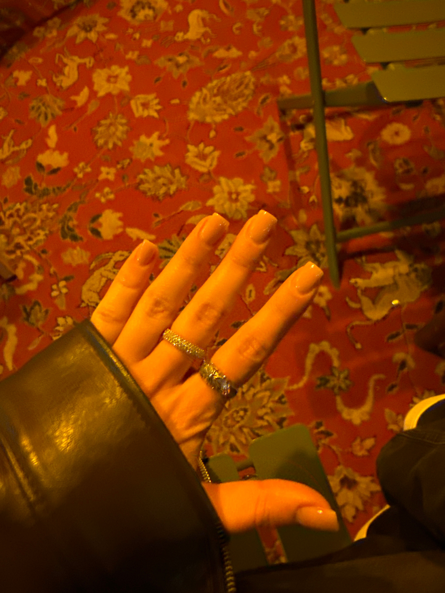 A hand, adorned with two rings, is positioned over an orange patterned tablecloth. A black leather jacket cuff frames part of the hand. The background includes what appears to be green metal furniture…read more